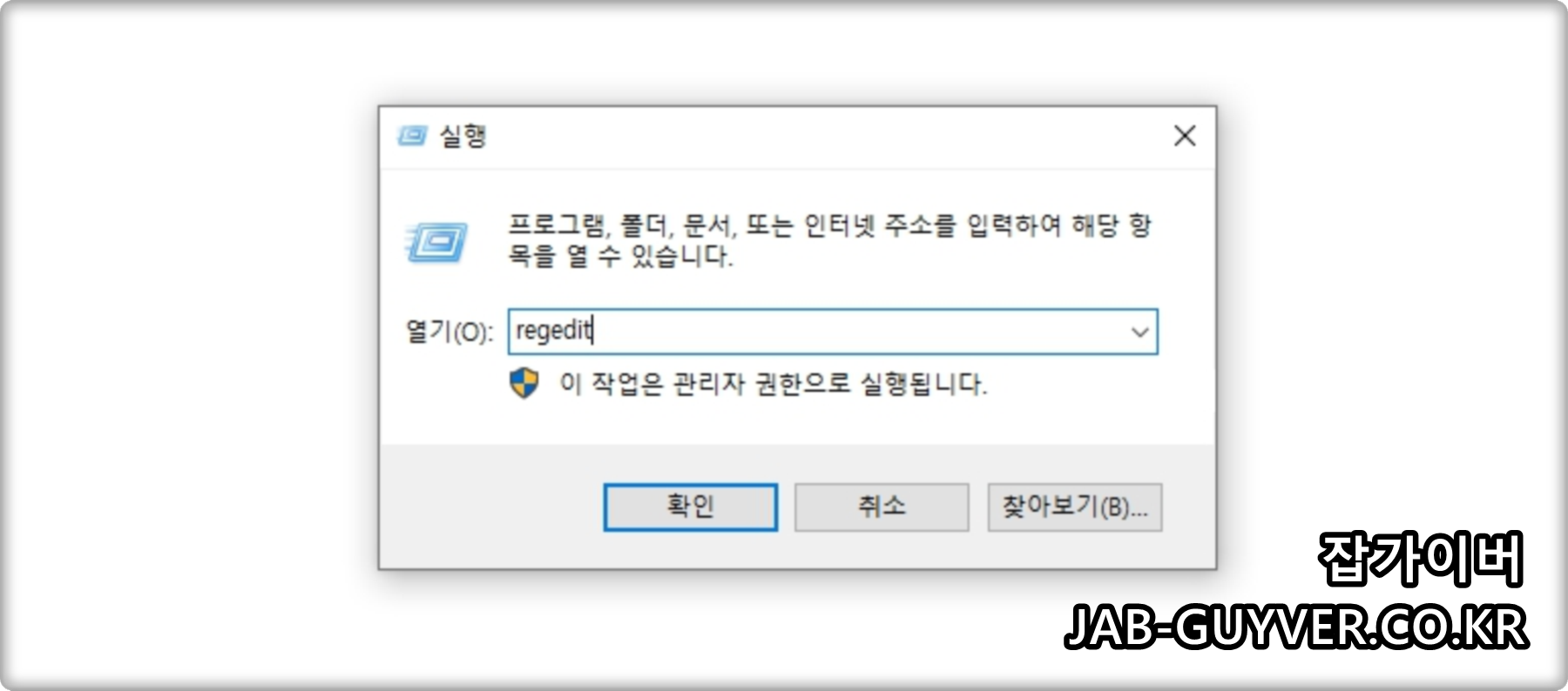 윈도우 키 + R 눌러 실행창에 Regedit 입력 후 엔터 "레지스트리 편집기" 실행합니다.