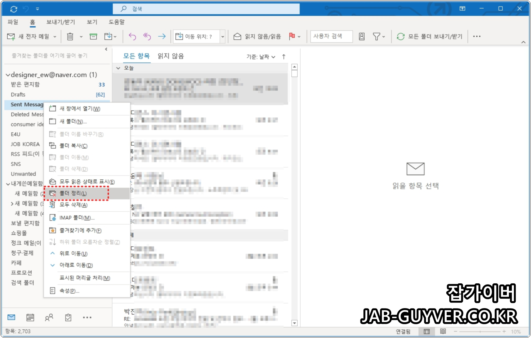 보낸 메일함을 우클릭해서 폴더정리를 선택합니다.