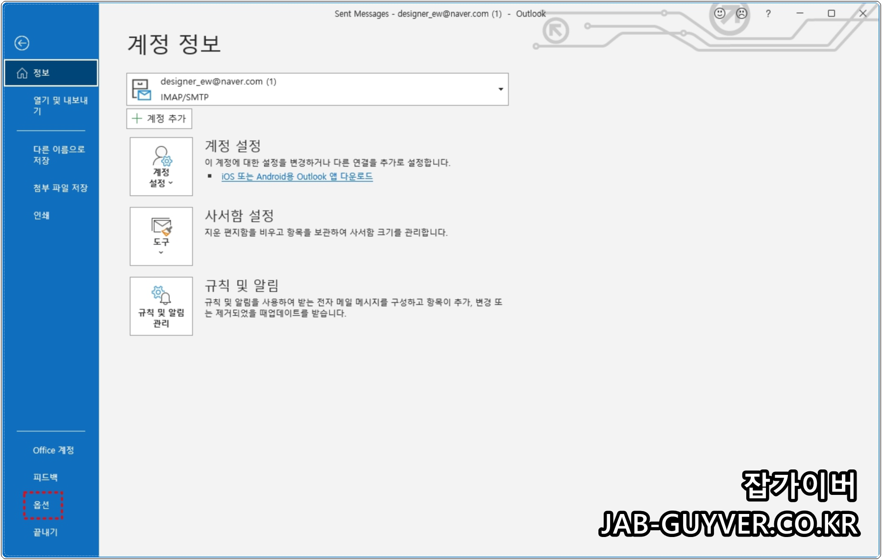 아웃룩 메일이 계속 2개씩 전송된다면 옵션으로 들어갑니다.