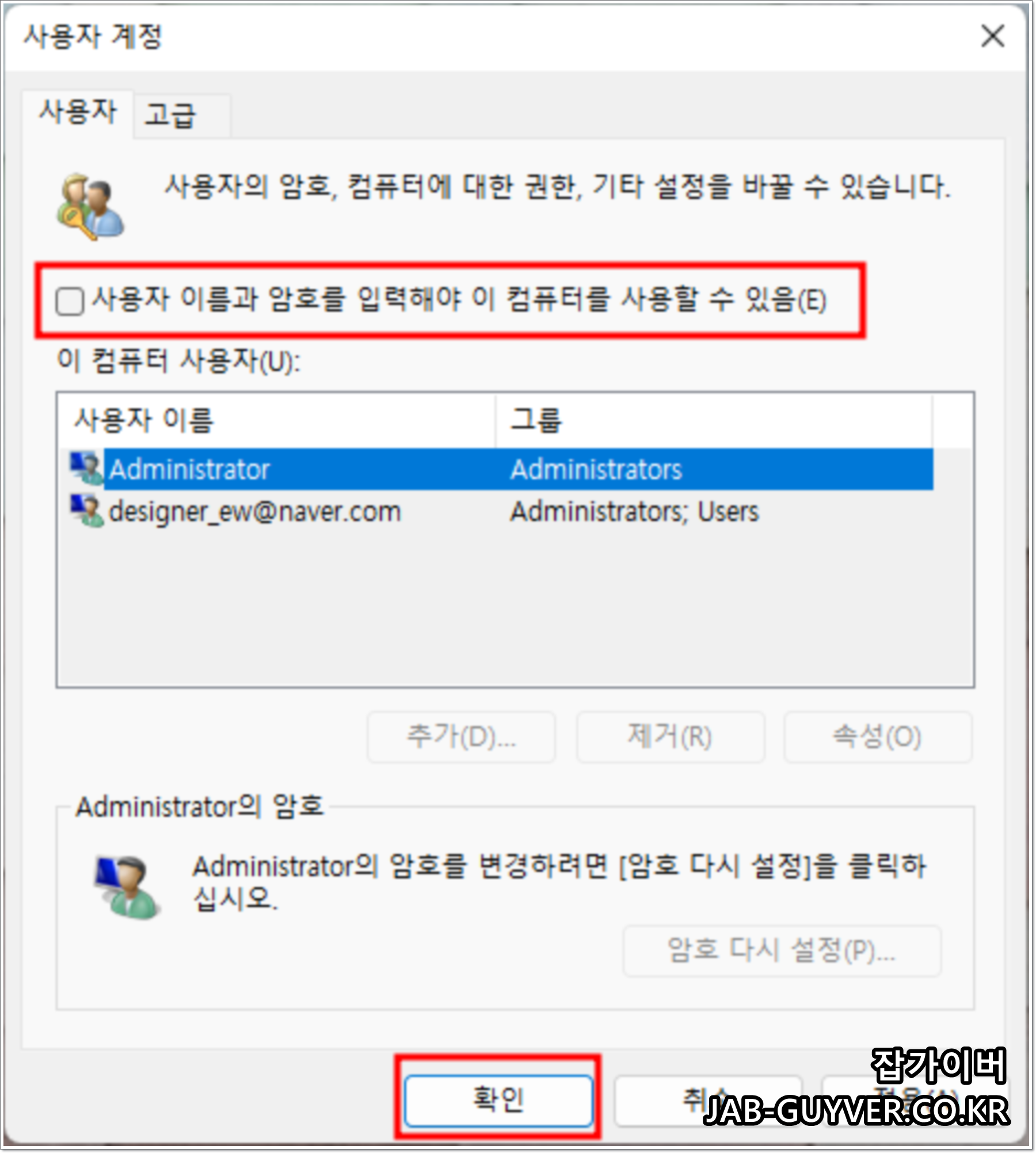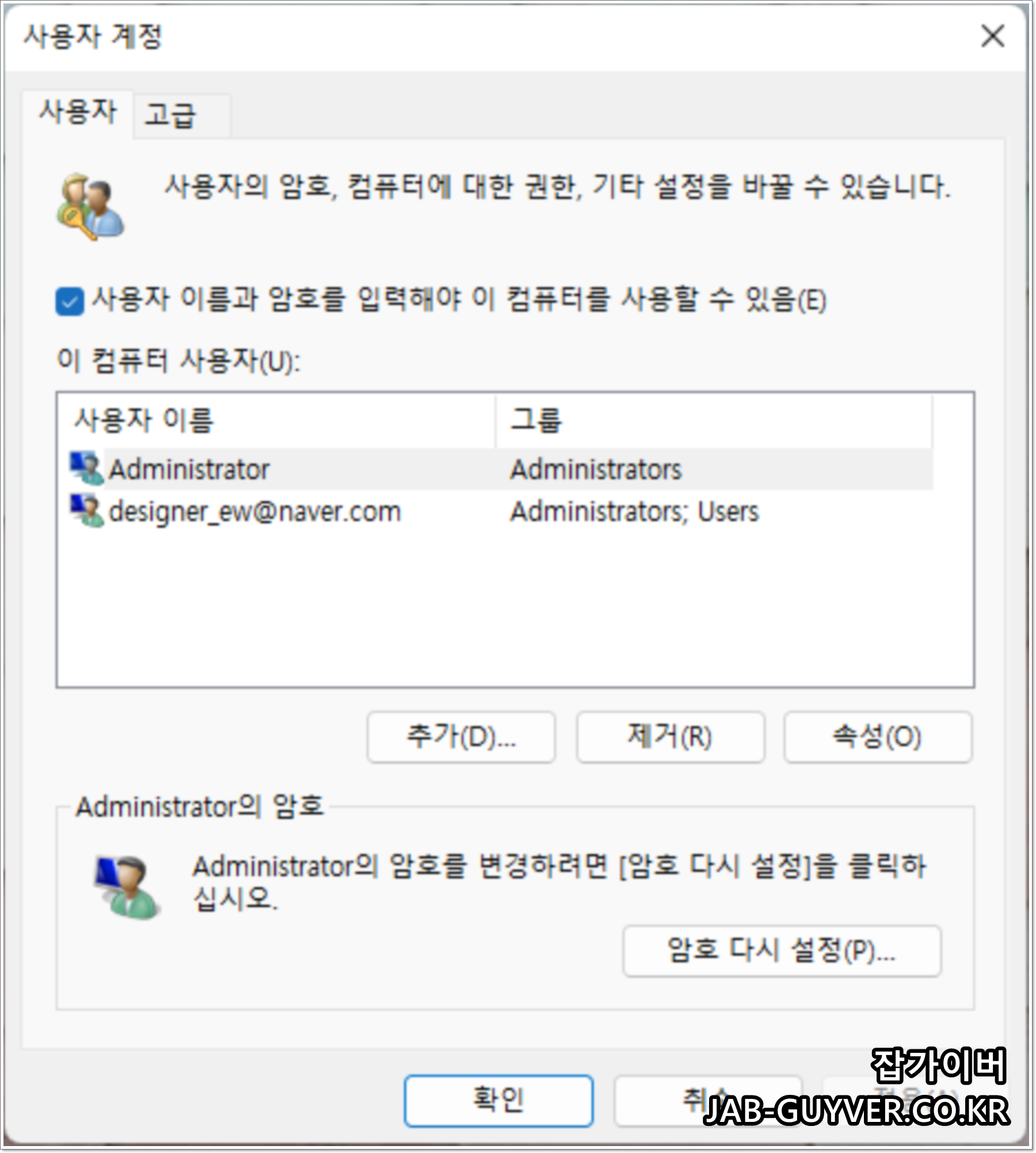 사용자계정에 보면 현재 Administrator 그룹을 확인할 수 있습니다.