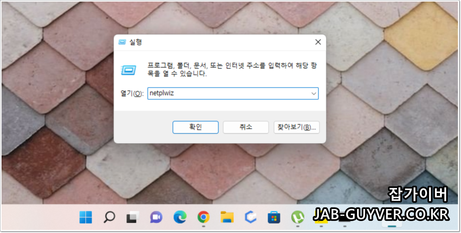 윈도우키 + R을 눌러 netplwiz를 입력 후 엔터를 눌러 사용자계정을 실행합니다.