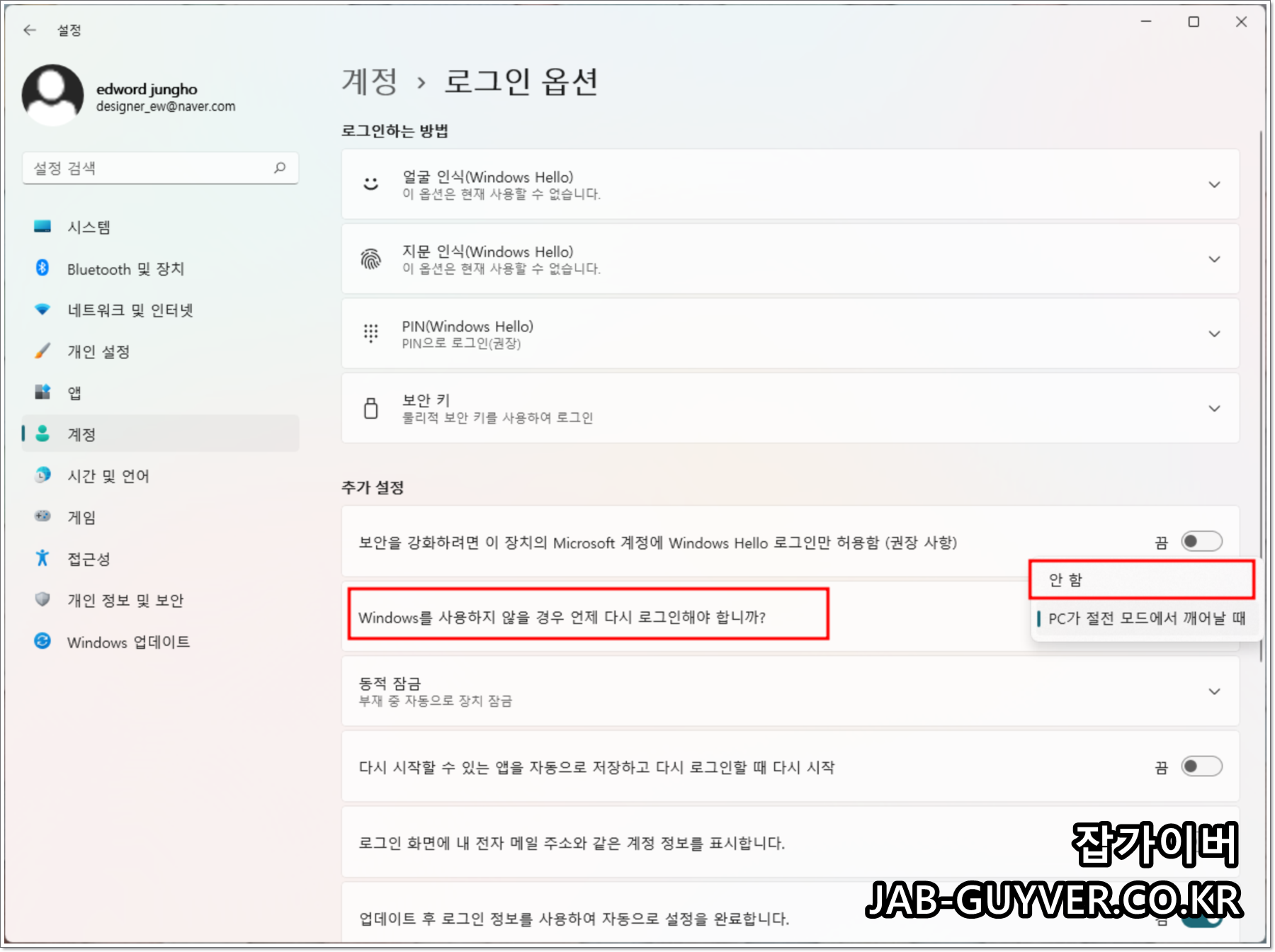 윈도우11 절전모드 로그인 비활성화