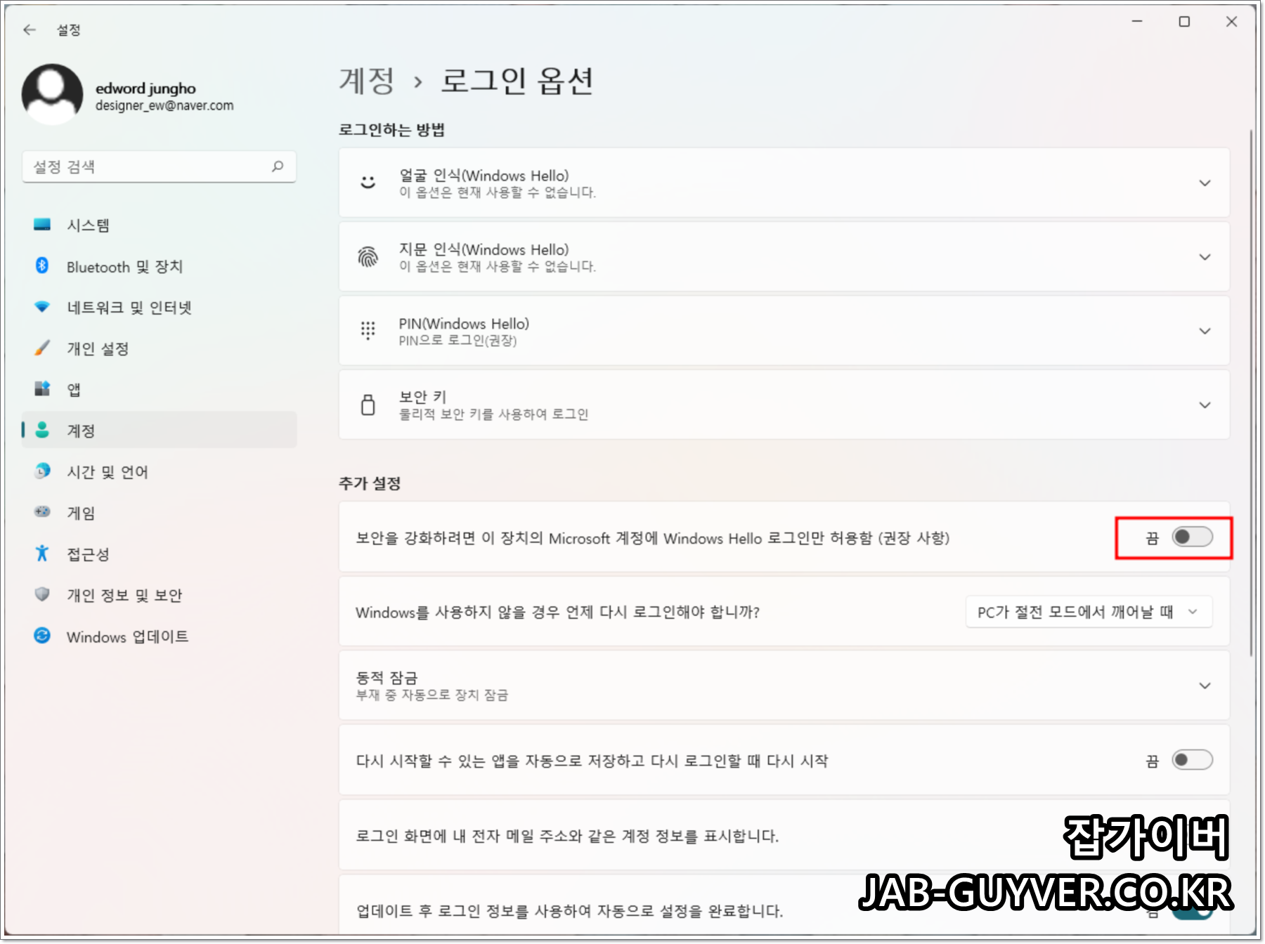 그리고 보안부팅 없이 자동으로 로그인되게 하고 싶다면 추가설정 -> 보안을 강화하려면 이 장치의 Microsoft 계정에 Windows Hellow 로그인만 허용함을 체크해제합니다.