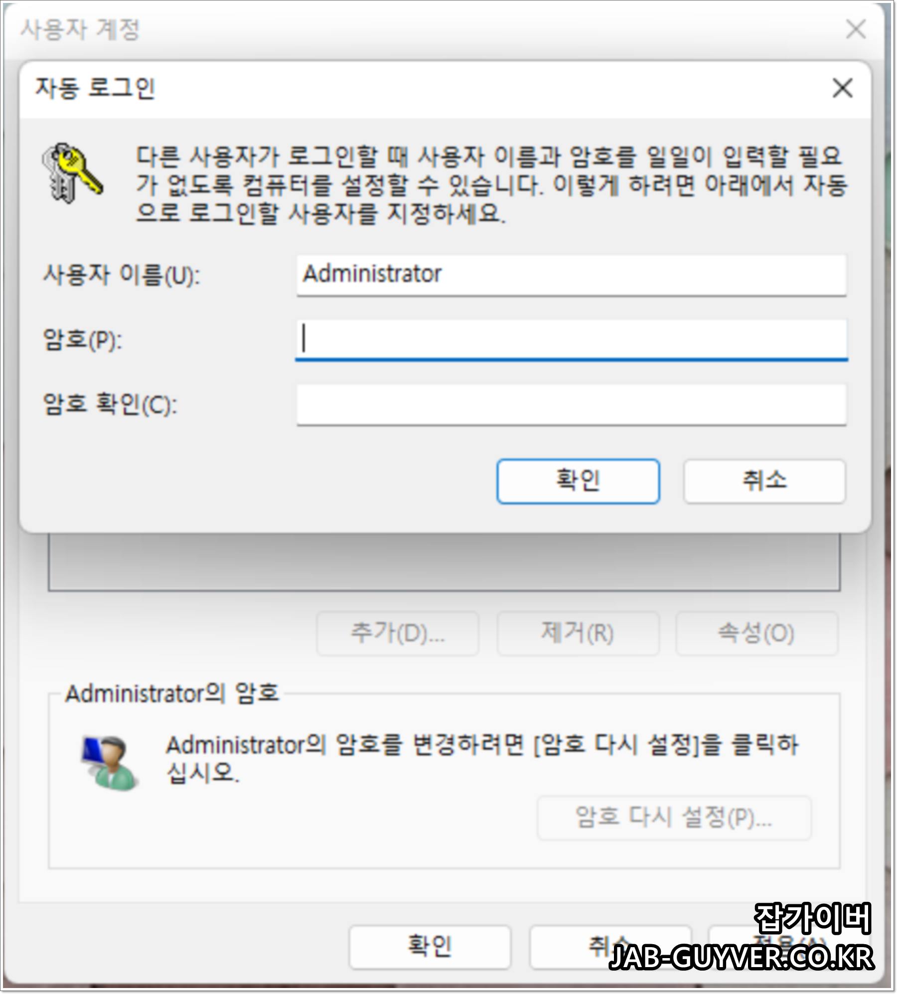 만약 관리자계정 비밀번호 삭제하고 싶다면 새 암호를 빈 공간으로 두고 확인을 눌러주면 관리자계정 로그인 시 암호도 삭제됩니다.