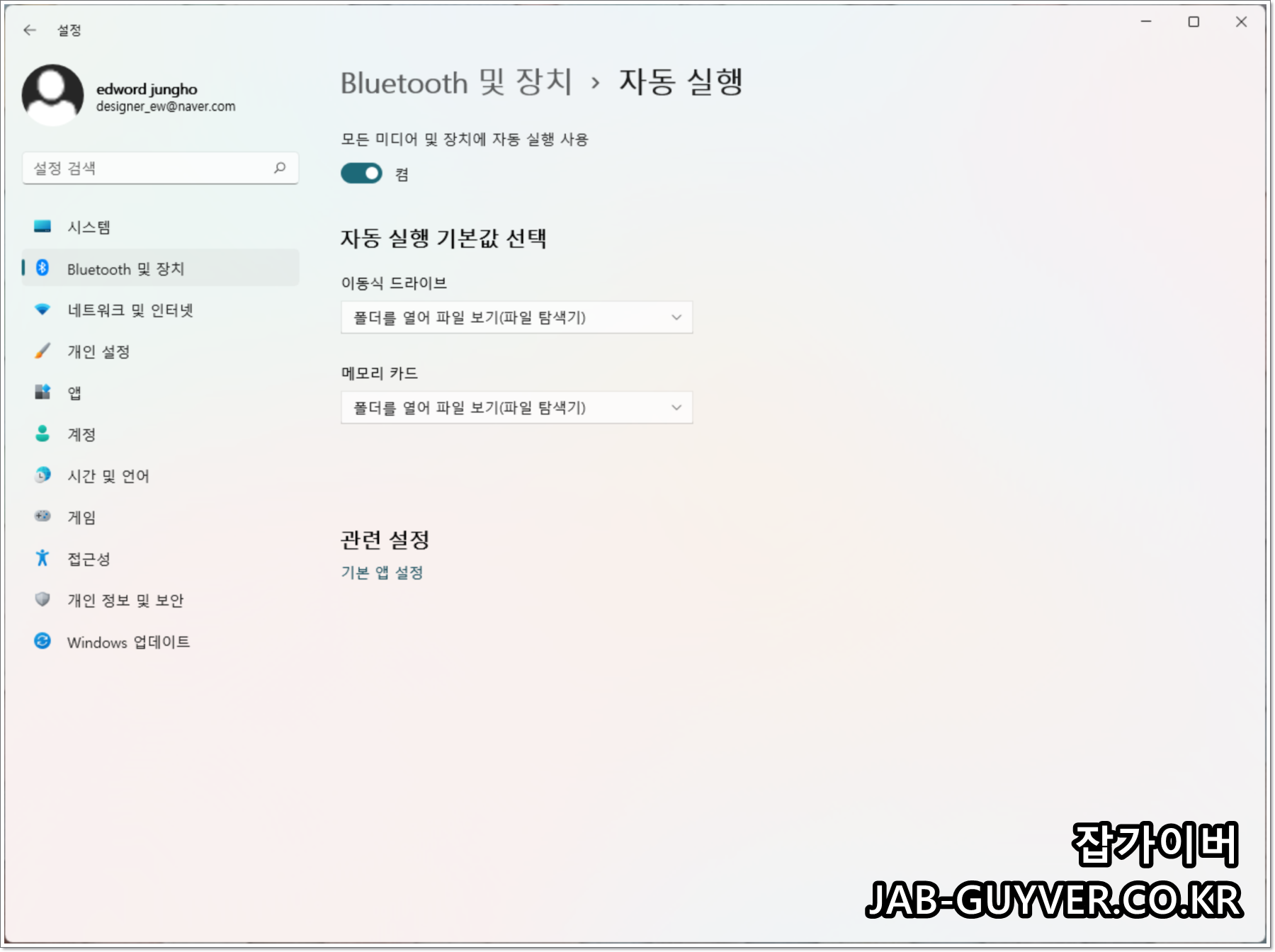 Bluetooth 및 장치 -> 자동실행을 선택하면 이동식 드라이브 및 메모리카드의 기본값을 설정을 키거나 끌 수 있습니다.