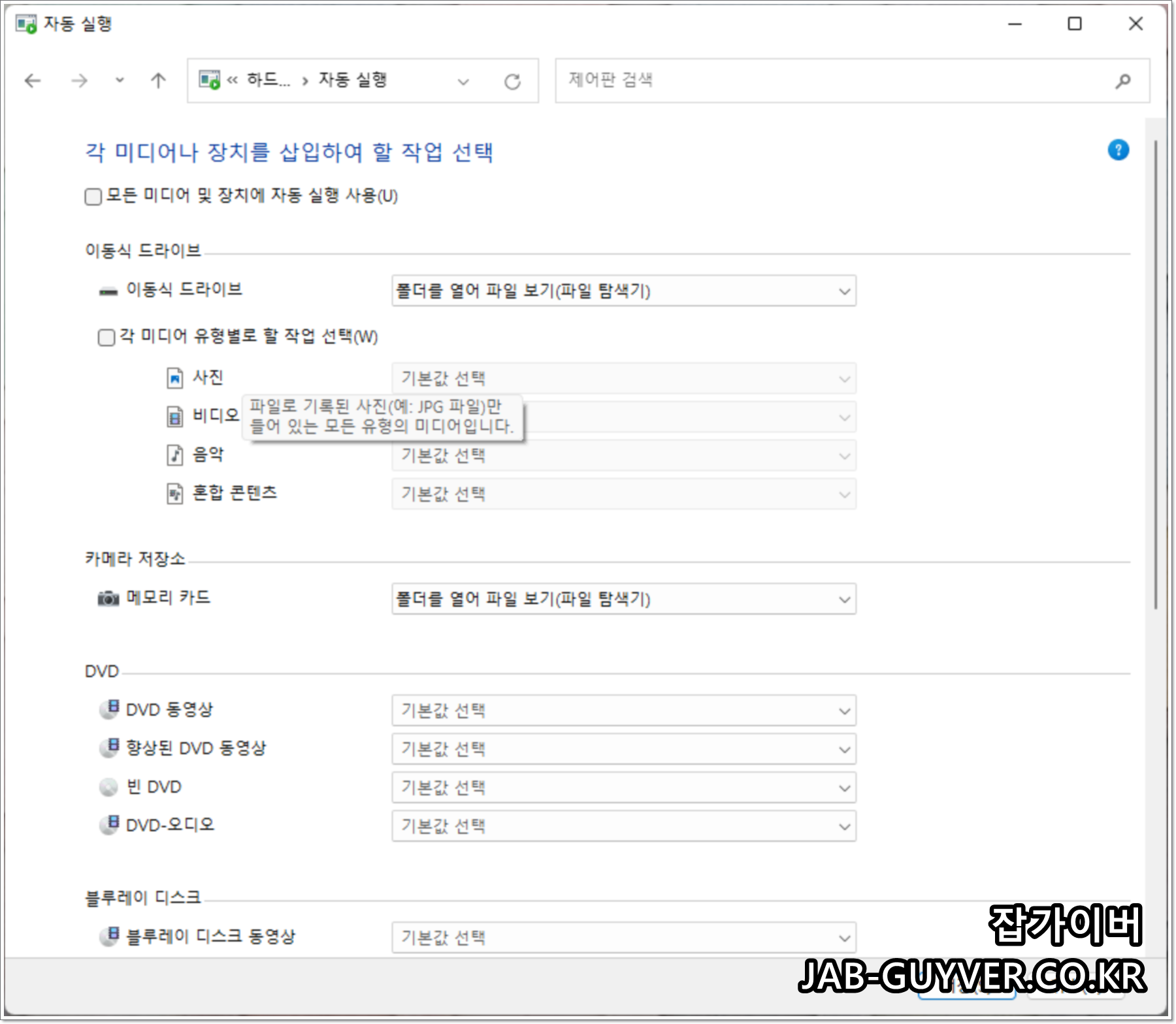 그럼 모든 미디어 장치에 자동실행을 키거나 끌 수 있습니다.