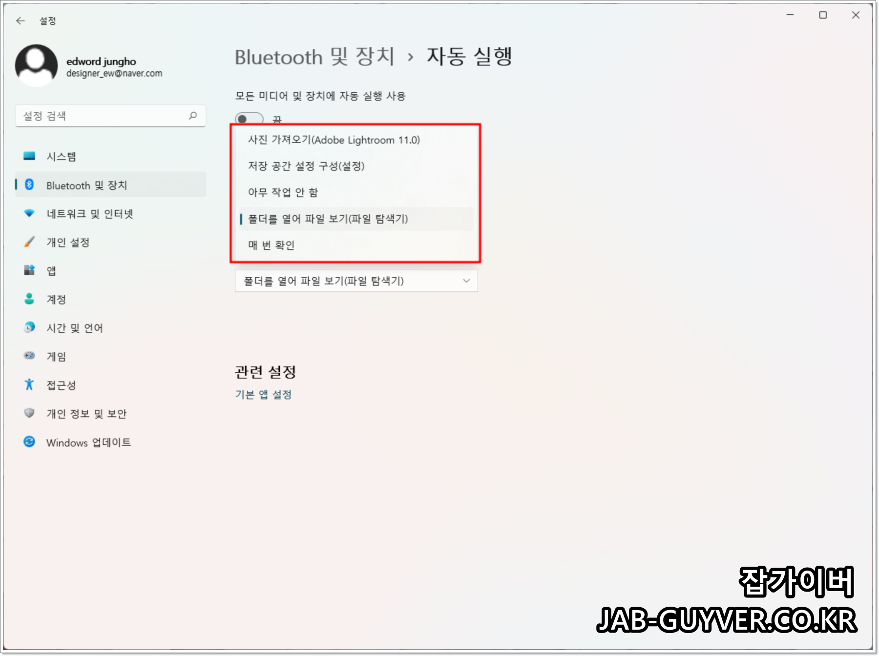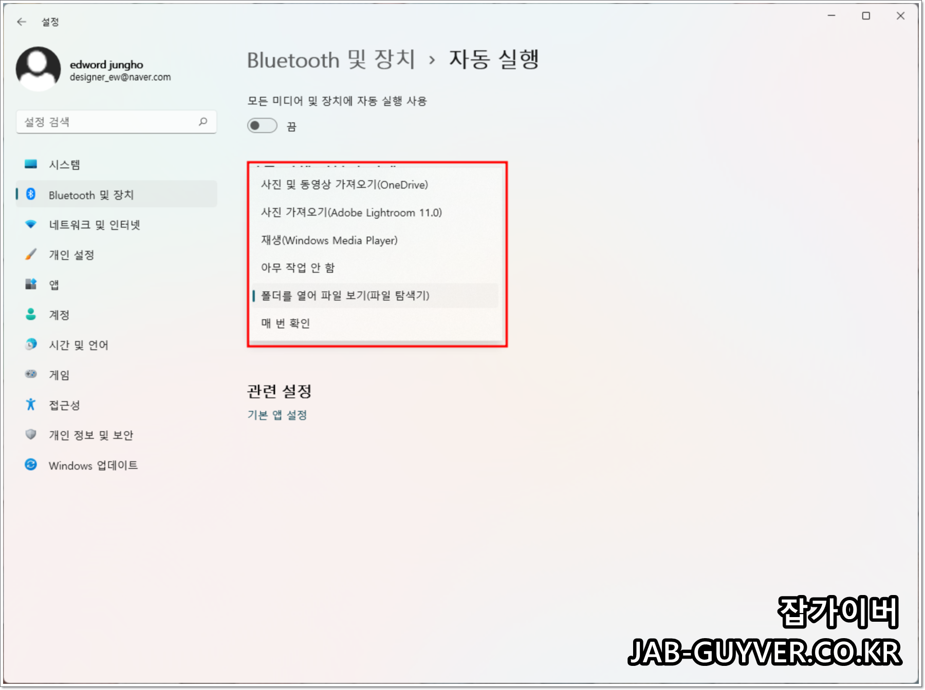 Bluetooth 및 장치 -> 자동실행을 선택하면 이동식 드라이브 및 메모리카드의 기본값을 설정을 키거나 끌 수 있습니다.