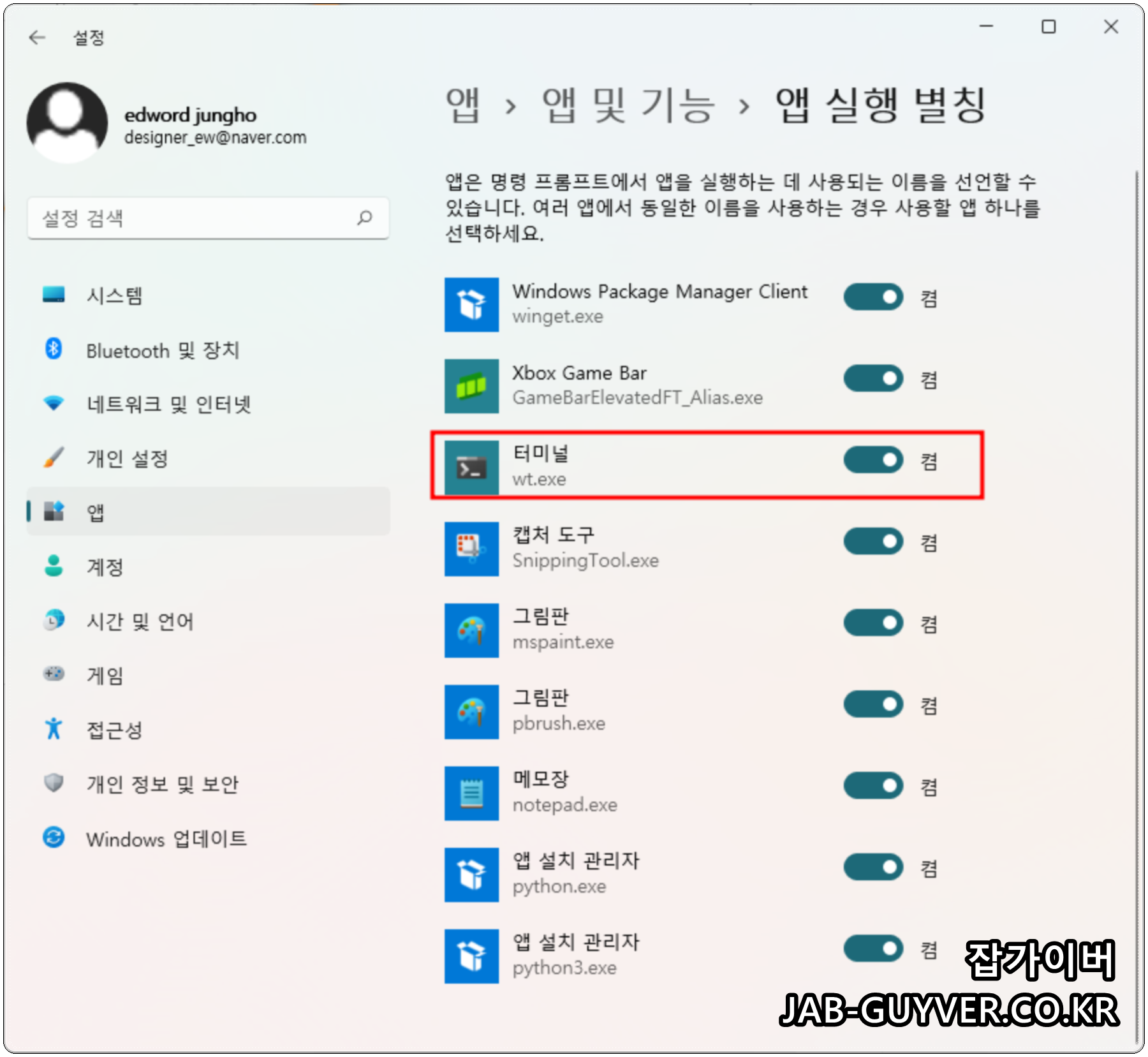 윈도우 설정 -> 앱 -> 앱 및 기능 -> 기타설정 -> 앱 실행 별칭으로 들어갑니다.