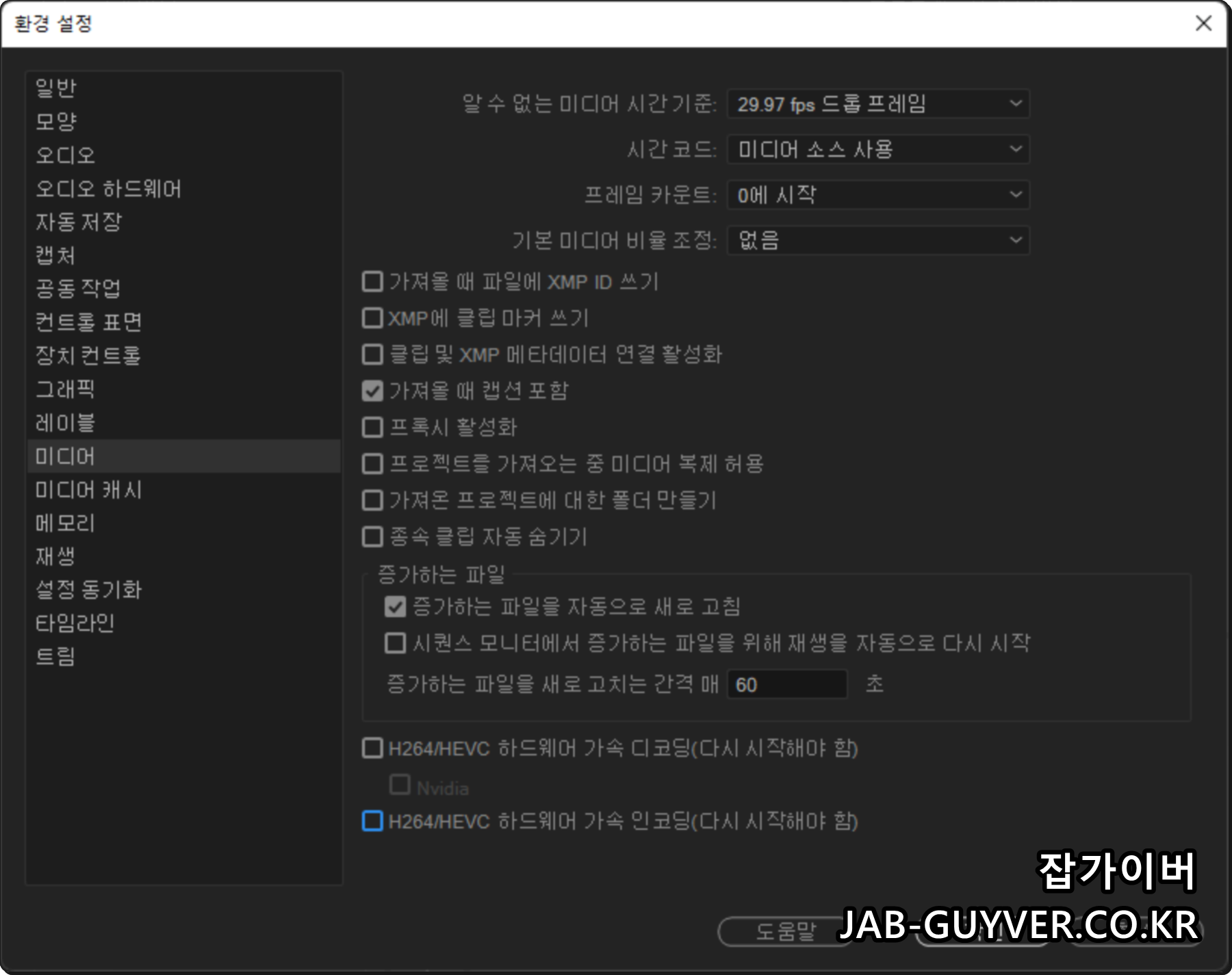 프리미어 환경설정 미디어 캐시삭제