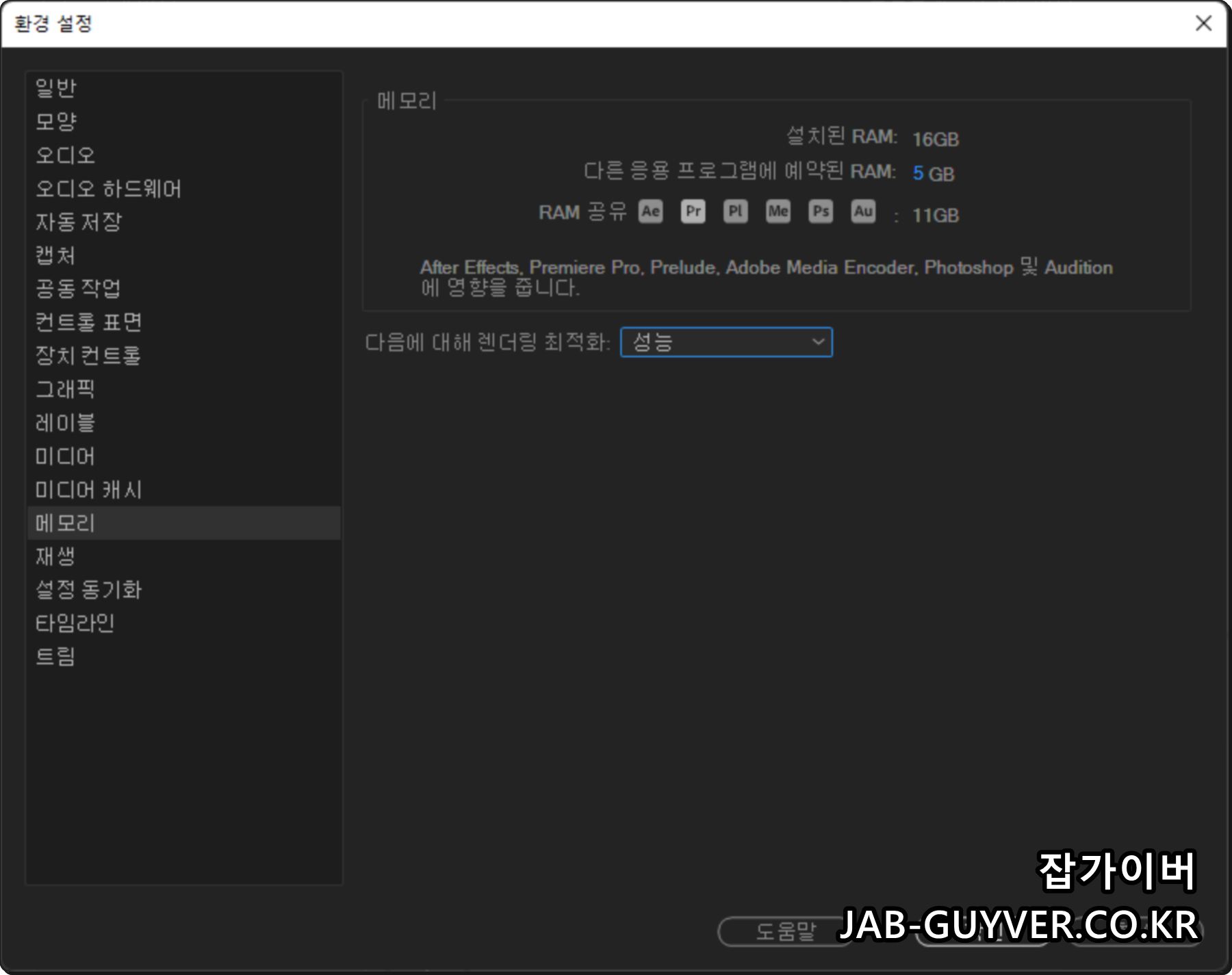 메모리 설정으로 프리미어 안정성 높이기