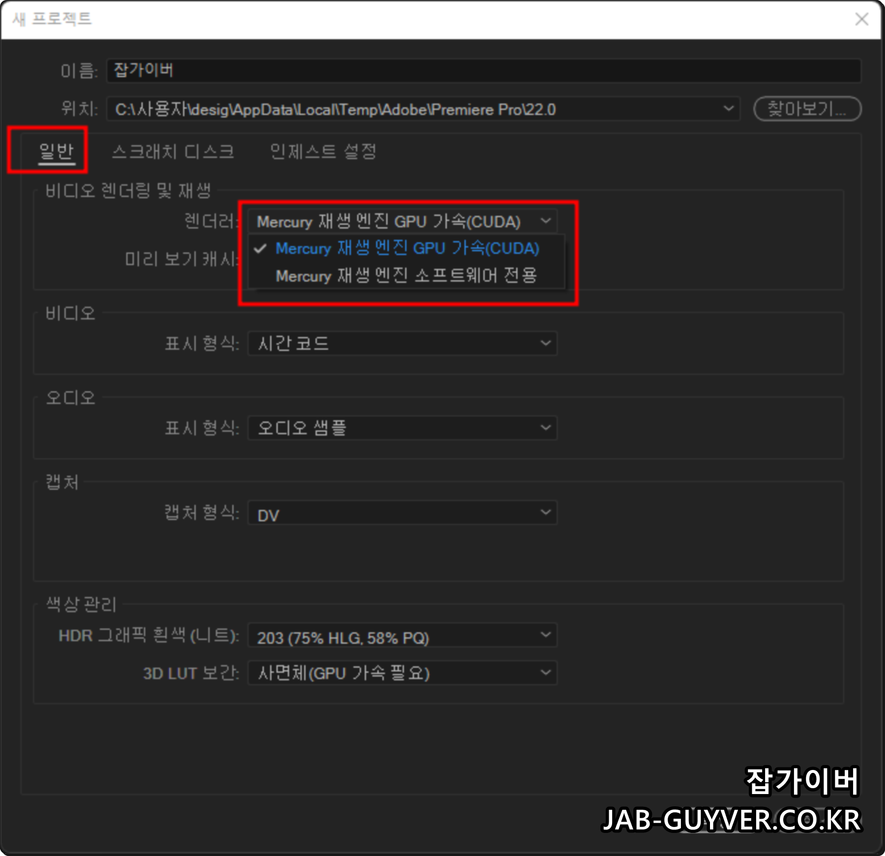 시퀀스 설정에서 기본값은 보통 Mercury 재생 엔진 GPU 가속으로 되어 있습니다. GPU와 드라이버가 안정적으로 받쳐주면 좋은 설정이지만, 일부 PC나 드라이버 버전에서는 이 부분 때문에 오히려 인코딩이 멈추는 경우가 있습니다.