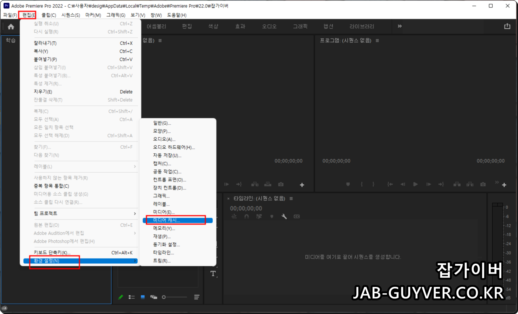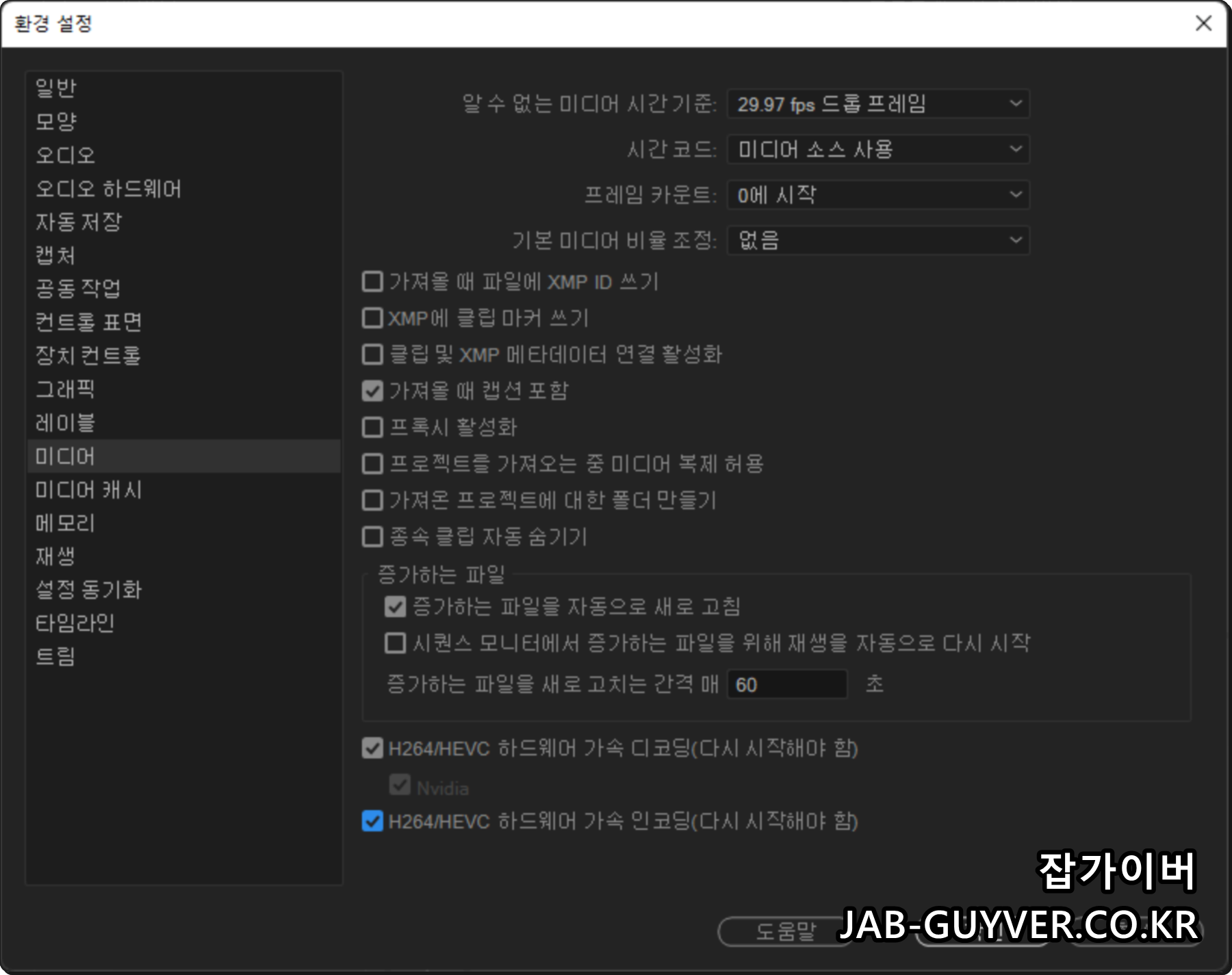 상단 메뉴에서 편집 > 환경설정 > 미디어로 들어가면, H.264 / HEVC 하드웨어 가속 디코딩·인코딩 옵션과 미디어 캐시 경로를 함께 확인할 수 있습니다.