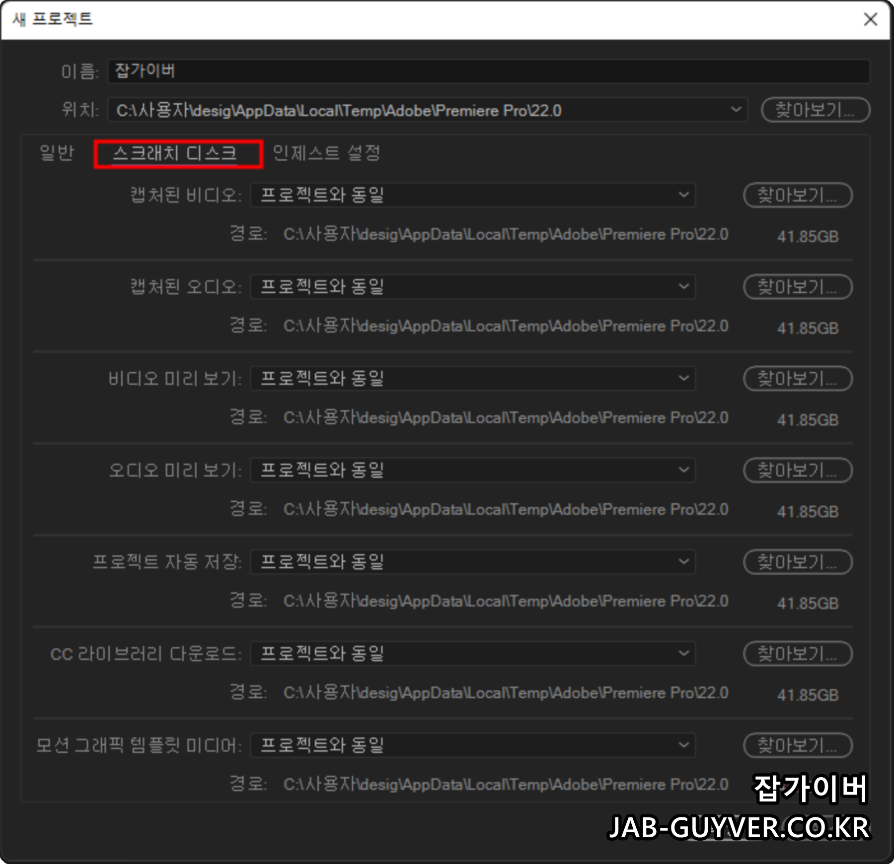 이미지 설명 : 스크래치 디스크 위치와 용량을 확인하는 프리미어 설정 화면