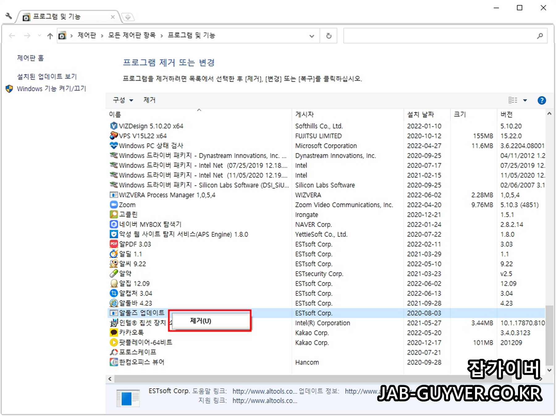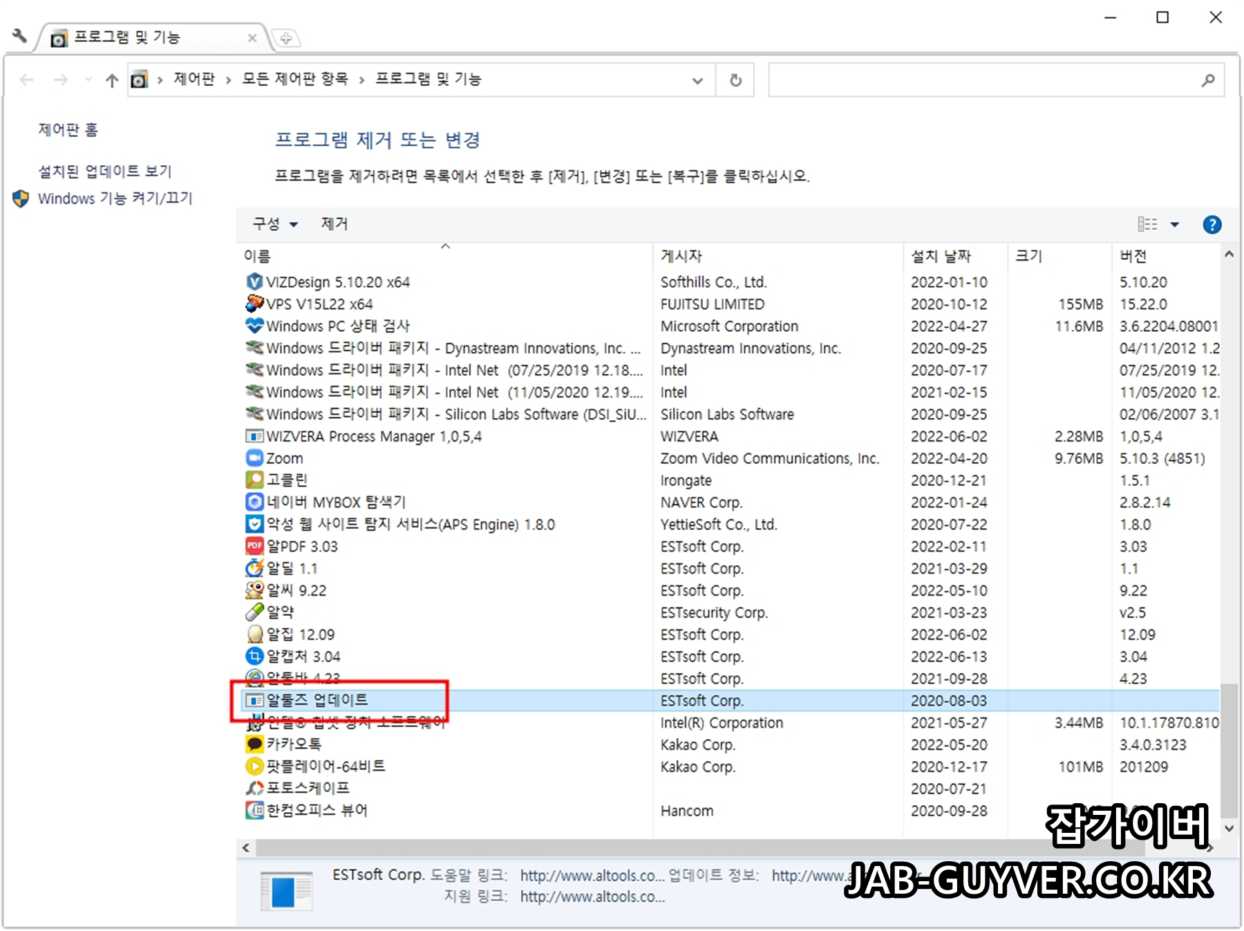 프로그램 제거 또는 변경에서 알툴즈 업데이트를 삭제합니다.