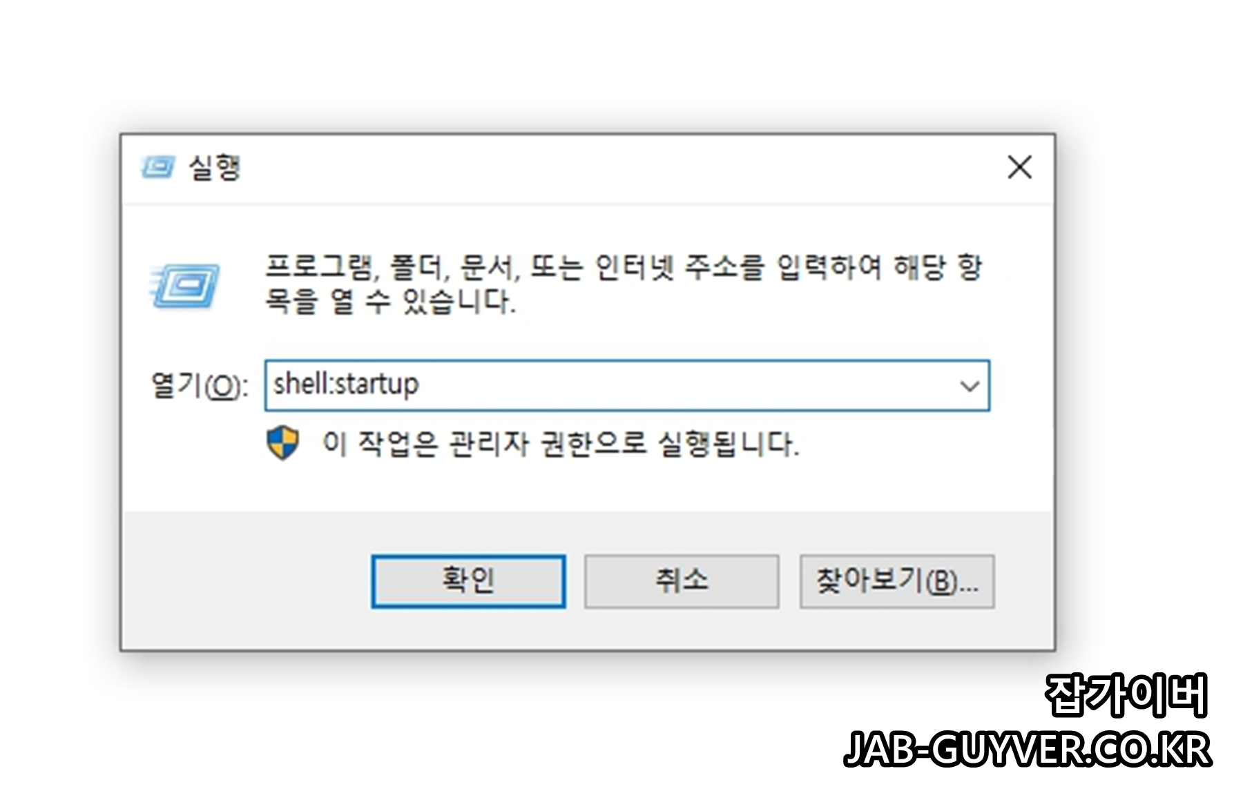 윈도우 키 + R을 눌러준 뒤 shell:startup 입력 후 확인을 눌러줍니다.