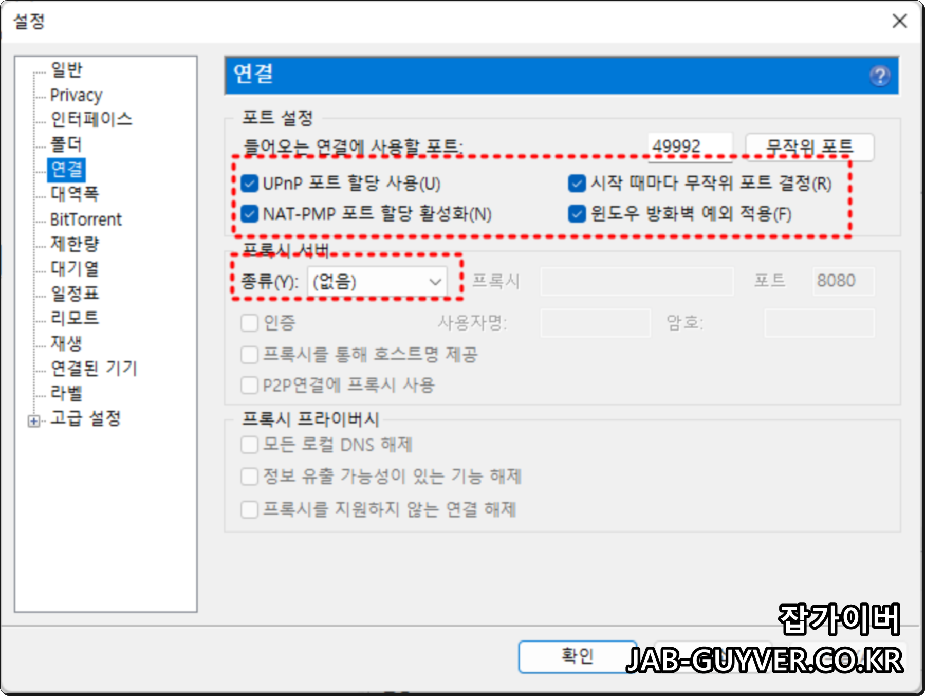 옵션 - 연결탭으로 이동 해서 토렌트 프록시 서버의 IP가 차단 된 곳을 우회해서 다운로드 시 속도가 저하될 수 있으니 사용하지 않느것이 좋습니다.