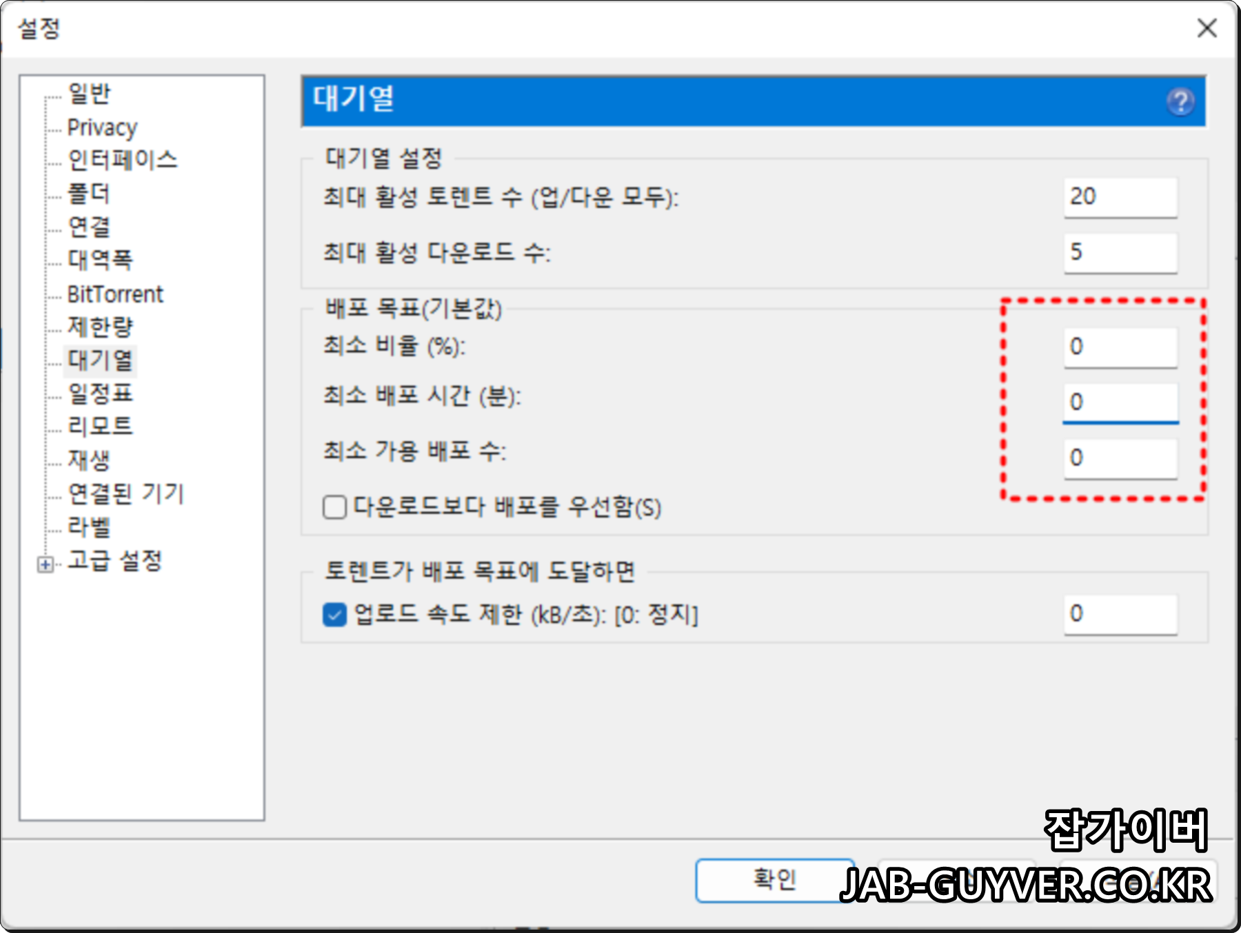 토렌트 배포가 목표에 도달 시 업로드 속도를 0으로 설정하면 다운로드 완료 후 자동배포되는것을 차단합니다.