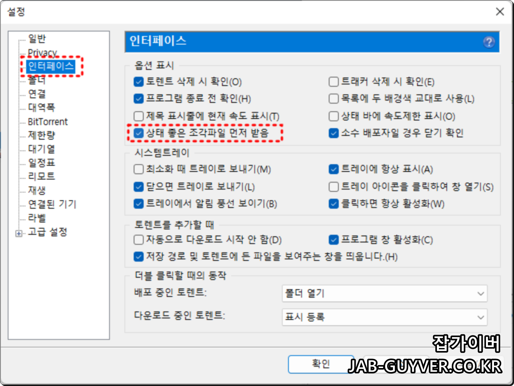 토렌트 옵션 - >인터페이스 탭에서 상태좋은 조각파일 먼저 다운로드 받도록 설정을 체크합니다.
