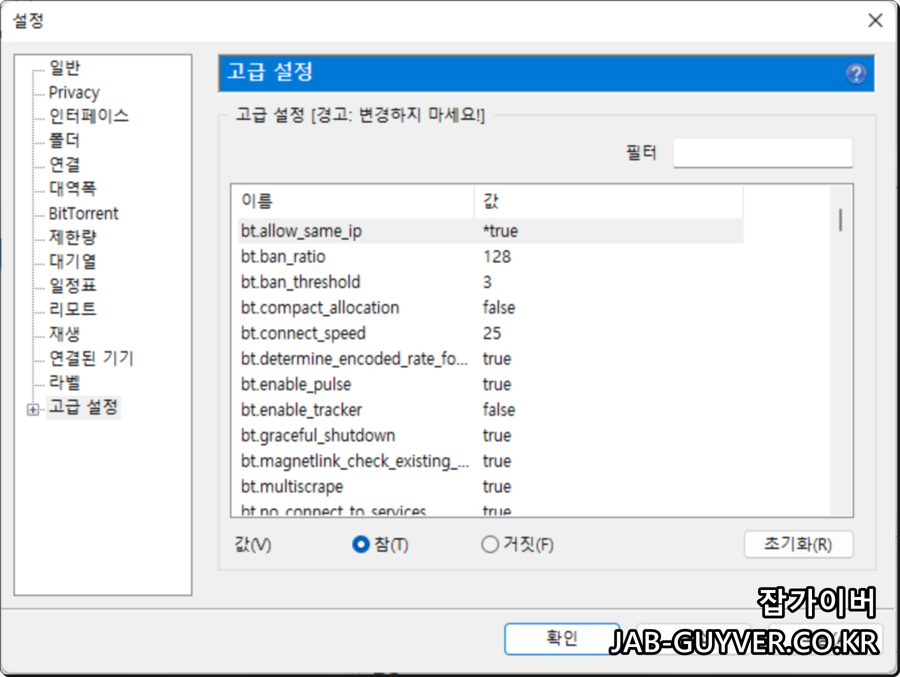 마지막으로 토렌트 고급설정을 아래 참 (Ture) 와 거짓 (False)를 설정해줍니다.