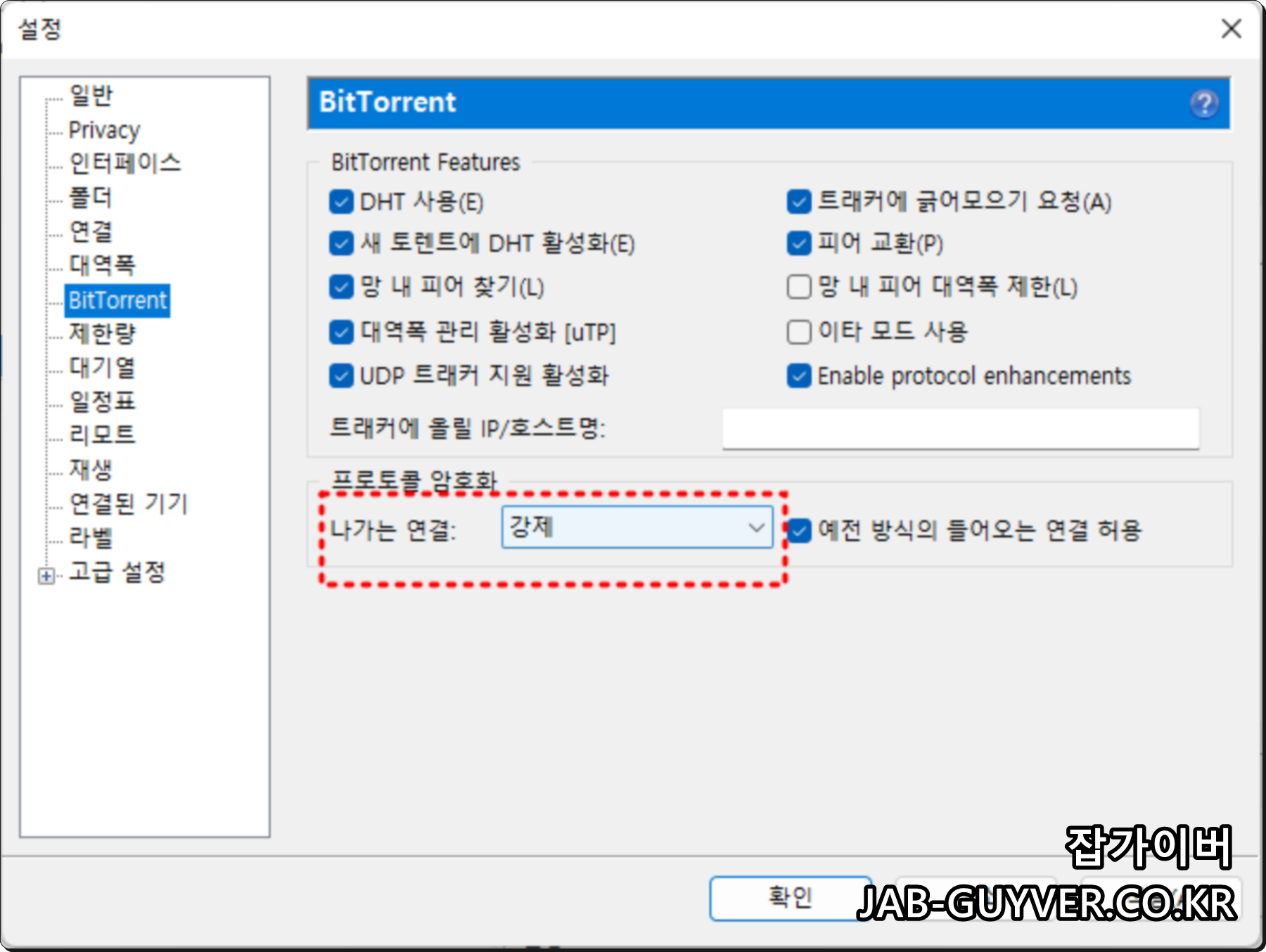 BitTorrent에서 프로토콜 암호화를 선택하면 외부의 연결이 강제로 암호화 된 연결만을 허용하게 되는데 이렇게 강제로 설정해 놓으면 보다 인터넷 보안에 안전하기 때문에 활성화를 해주느것이 좋습니다.