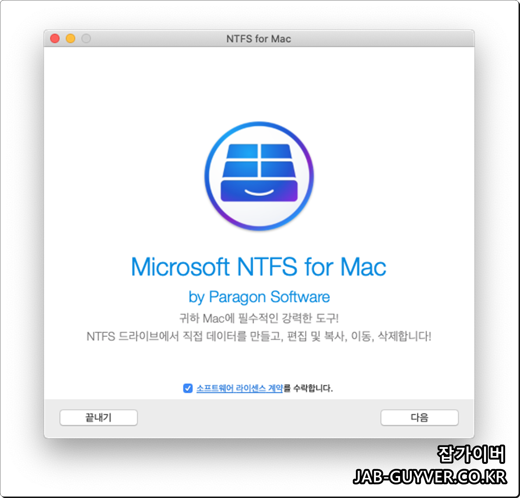 먼저 MACOSx에서 NTFS 포맷으로 변경하느것으로 데이터의 읽기 외 볼륨의 쓰기모드가 탑재되어 파일 및 폴더 쓰기, 편집, 삭제, 이름변경, 새로만들기 등이 가능하며 포맷, 무결성 검사 및 손상된 볼륨 복구가 가능합니다.