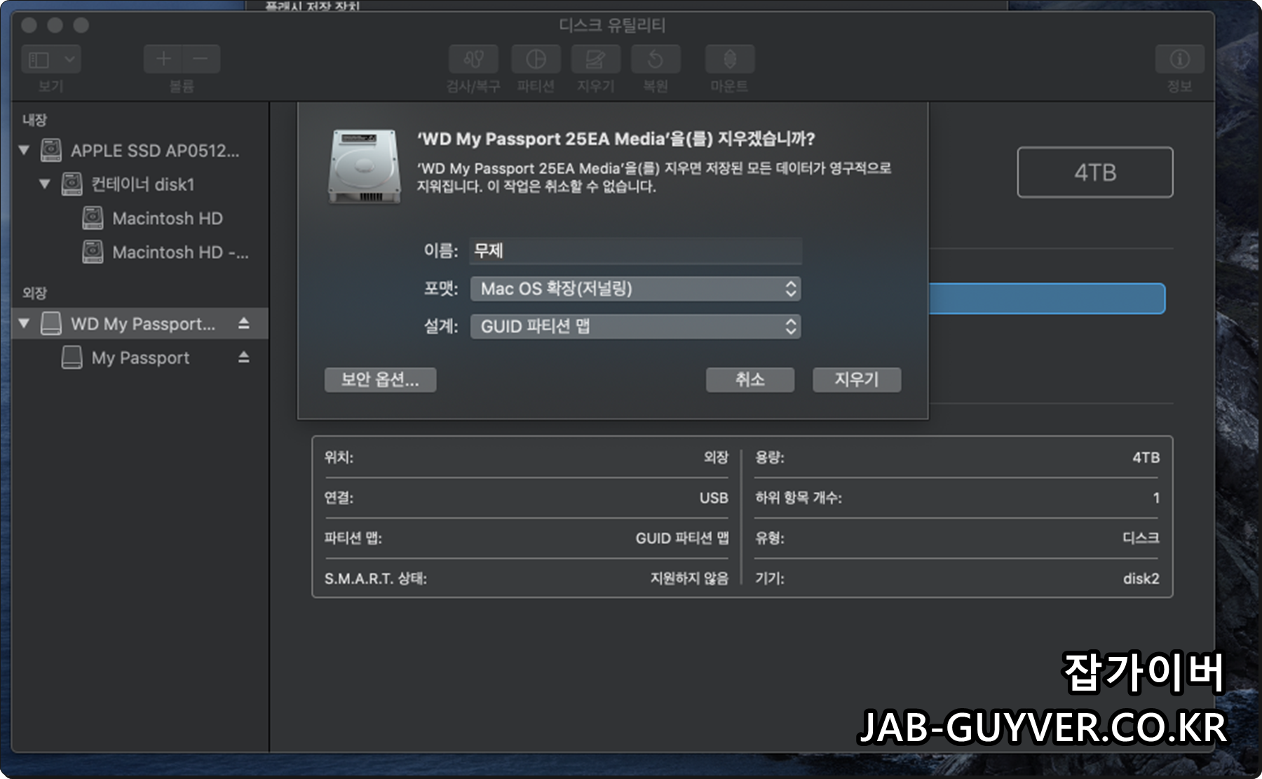 기본적으로 설계방식은 GUID 파티션 앱을 사용해 포맷하느것을 추천하며 포맷방식은 아래 내용을 참고해 삭제합니다.