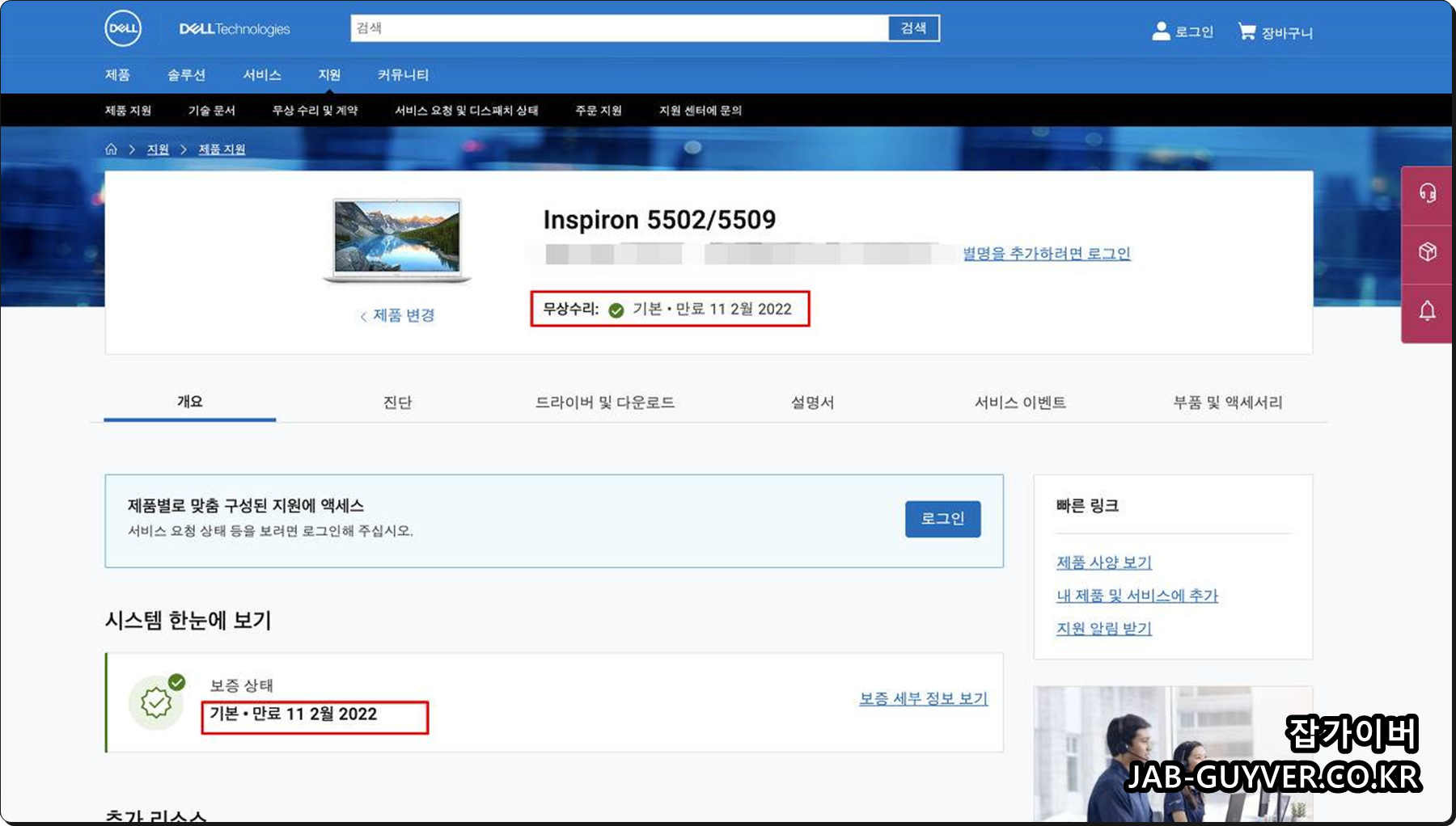 서비스 태그 검색 시 아래와 같이 해당 제품의 무상보증기간 및 드라이브 다운로드와 설명서 등 다양한 정보 등 확인이 가능합니다.