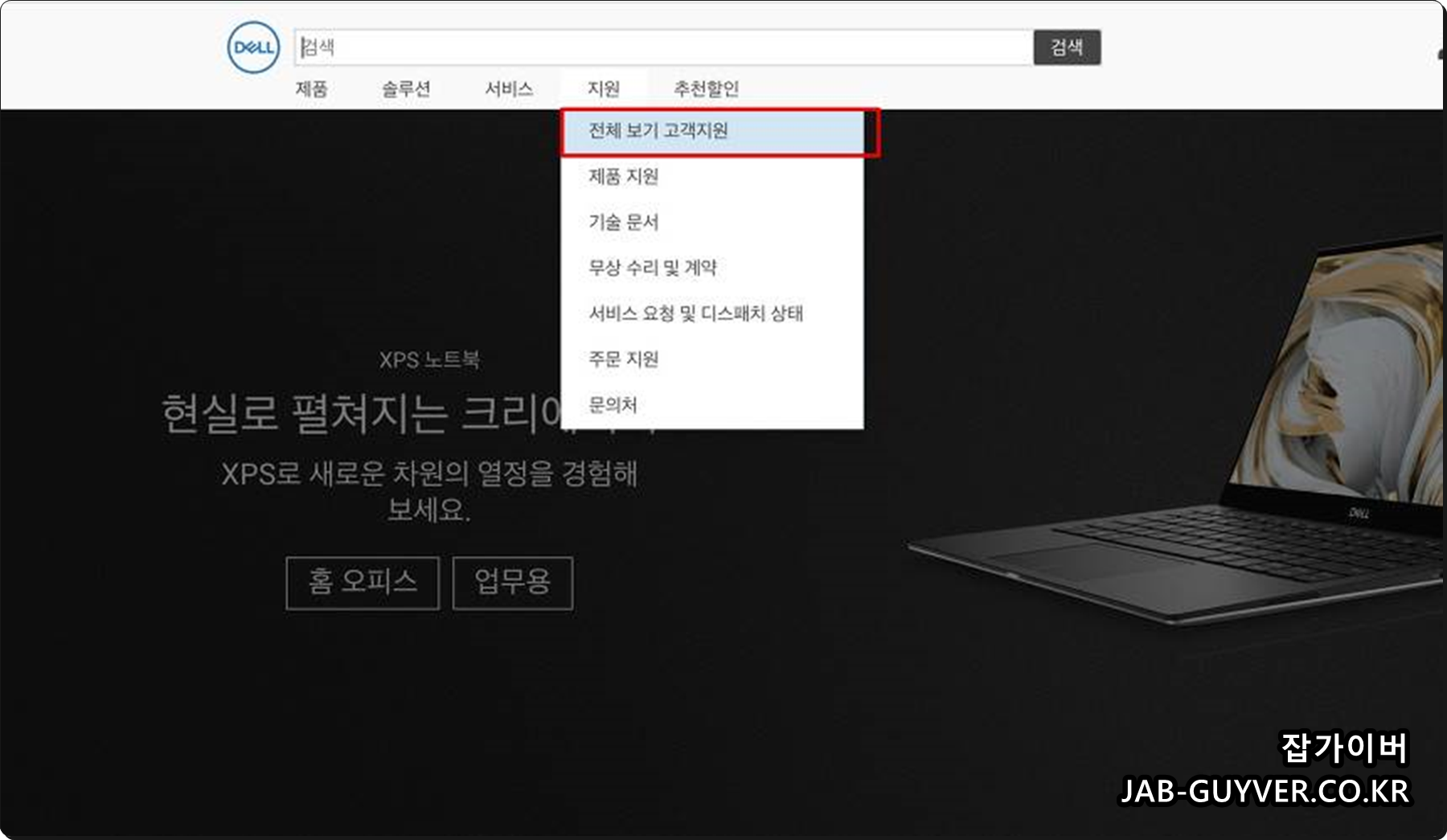 Dell 홈페이지(www.dell.com/ko-kr) > 지원 > '전체 보기 고객지원'을 선택합니다.
