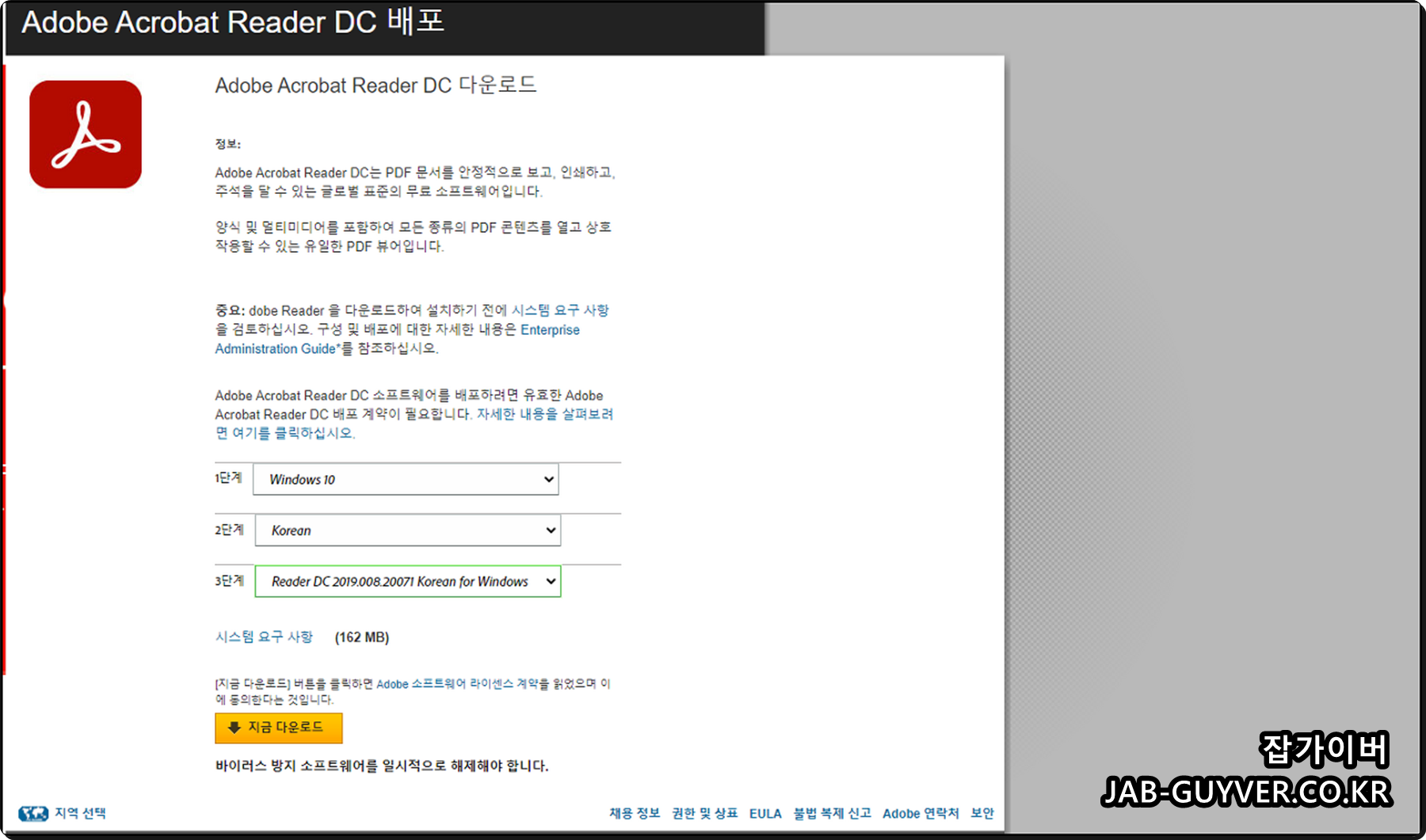 아래 사이트를 통해 Adobe Acrobat Reader DC를 접속 후설치할 운영체제와 언어, 버전등을 선택 후 다운로드 받습니다.