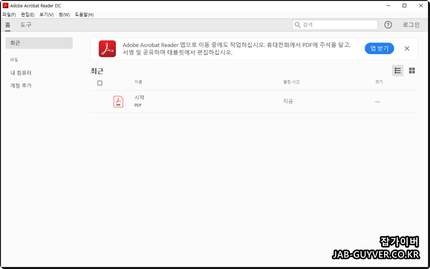 이후 설치오류 및 실행오류 없이 Acrobat Reder 실행됩니다.