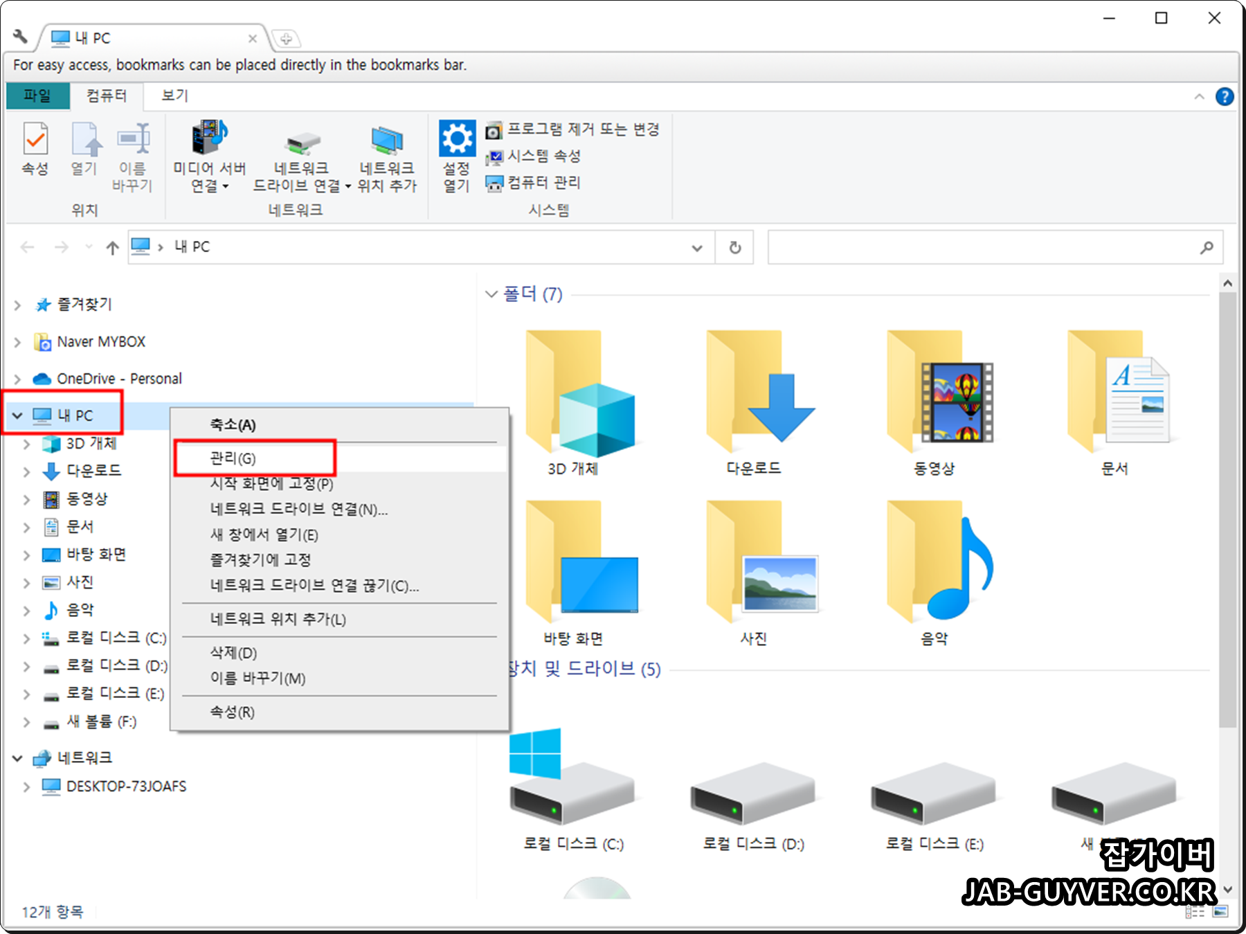 내PC -> 관리 -> 장치관리자로 들어갑니다.