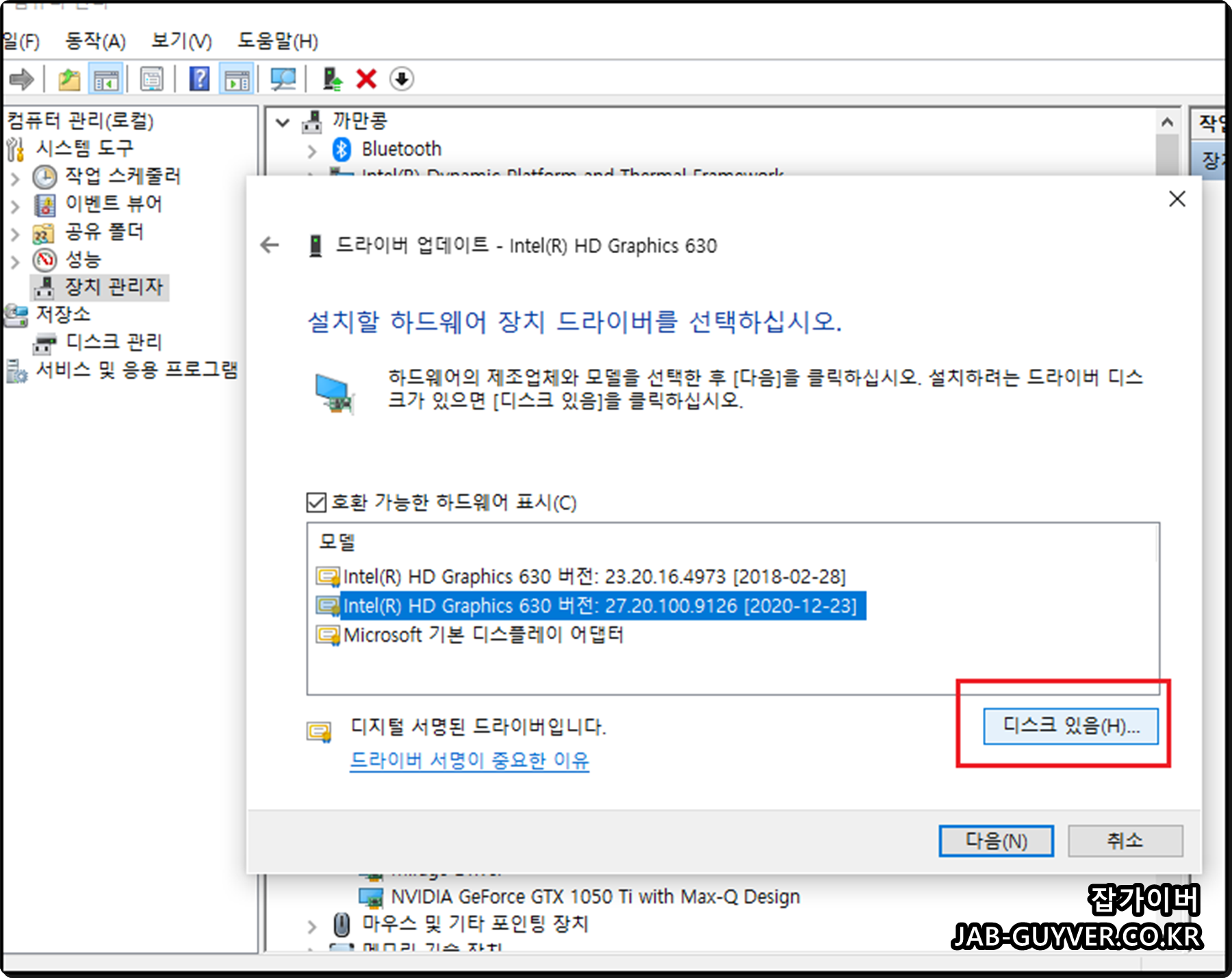 Intel(R) HD Graphics 630 버전으로 호환가능한 하드웨어가 표시되며 디지털 서명된 드라이버를 확인 후 디스크있음을 선택합니다.