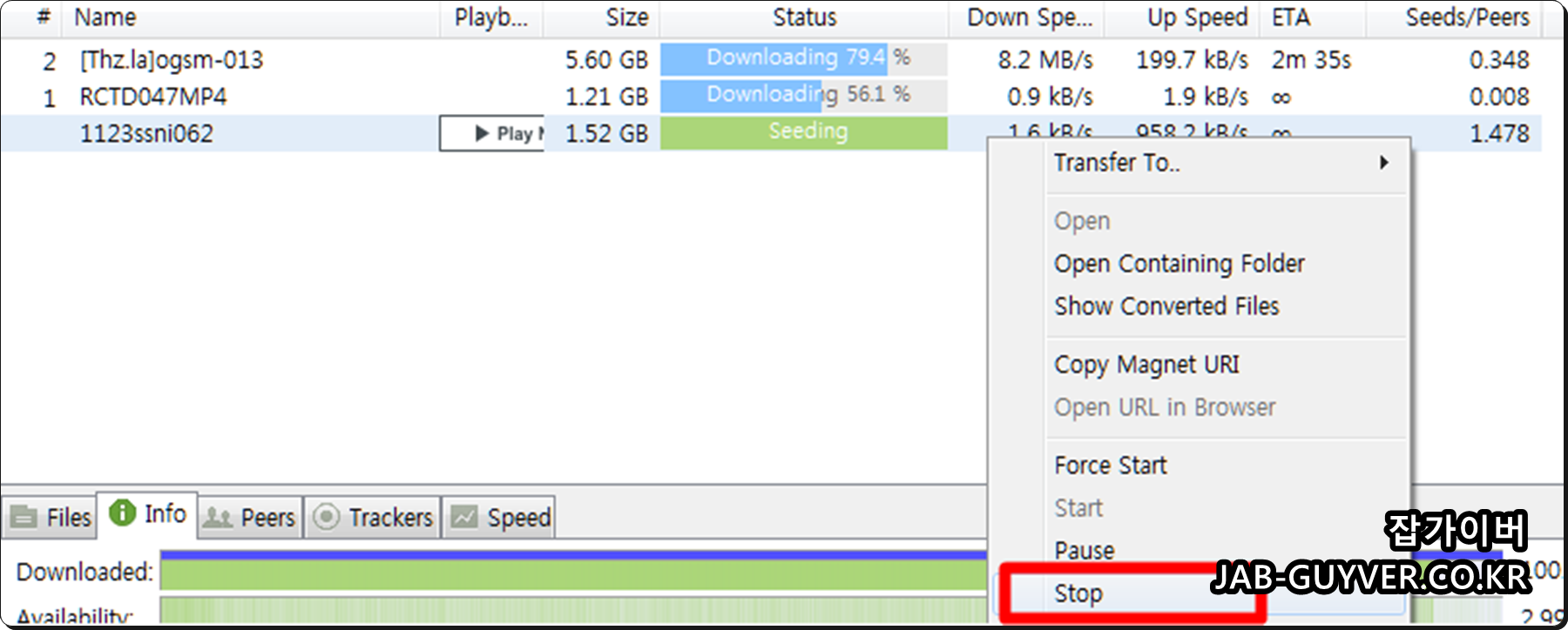 - 2 : 토렌트 주소 파일 + 다운로드 파일 모두 삭제(원치 않게 파일까지 지워질 수 있어 주의)