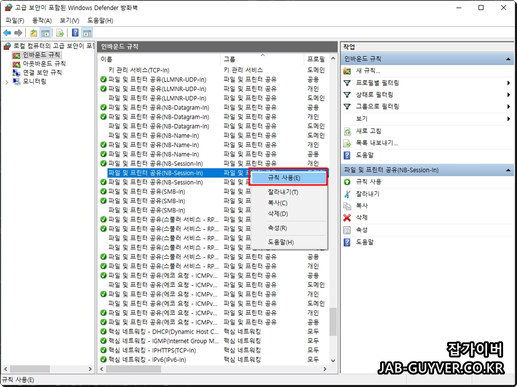 그중 파일 및 프린터 공유 (NB-Session-In)을 선택해 규칙 사용으로 바꿉니다. 같은 이름의 규칙이 여러 개라면, 개인/도메인 쪽이 켜져 있는지 함께 확인하면 좋습니다.