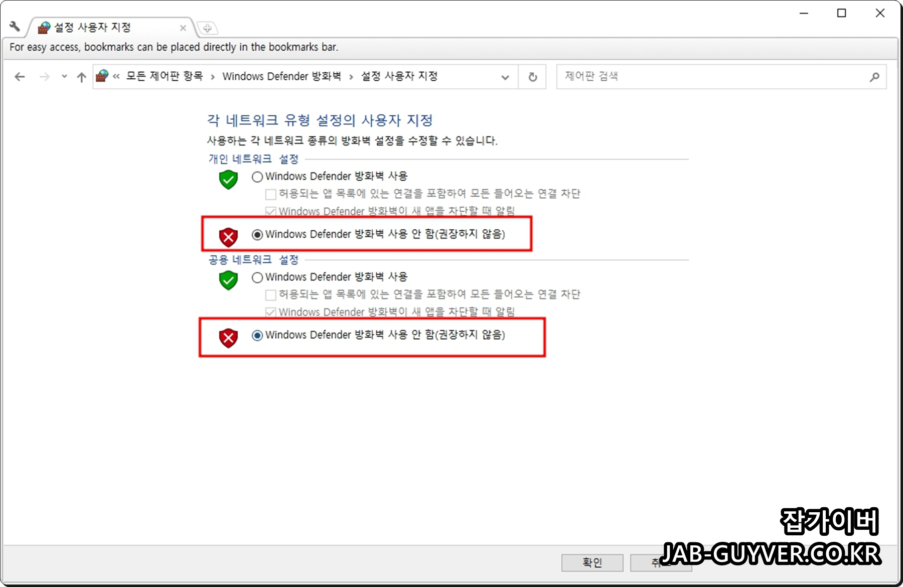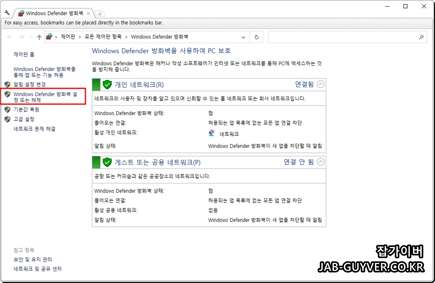 Windows Defender 방화벽 설정 또는 해제에서 개인/공용을 모두 끄는 방식은 문제를 “강제로” 없애는 쪽에 가깝습니다.