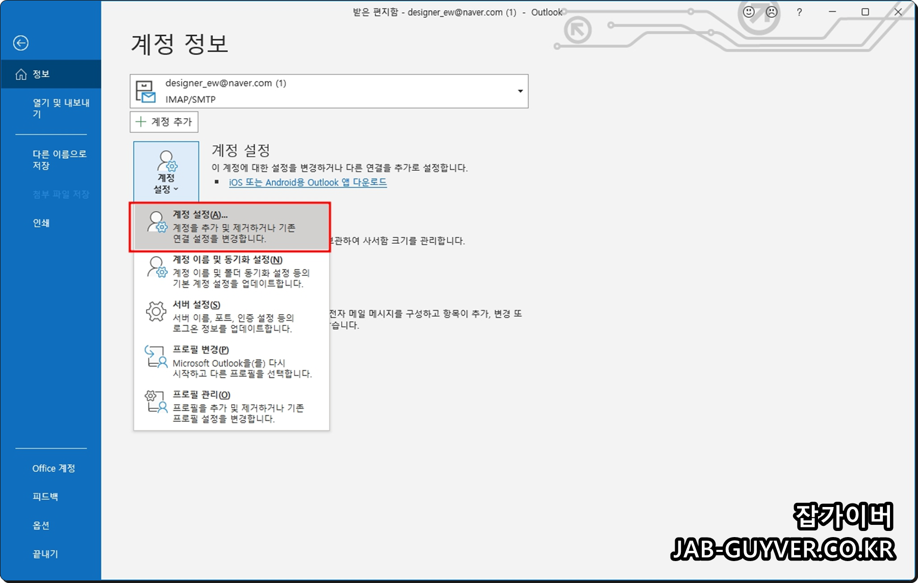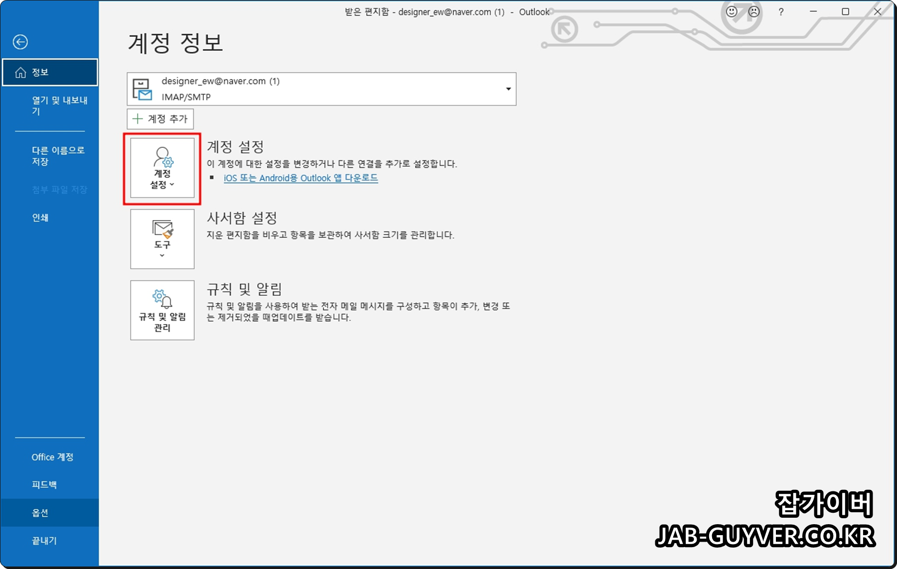 | 2단계 | 계정 설정 | 상단 메뉴에서 [파일] → [계정 설정] → [계정 설정] 클릭 |