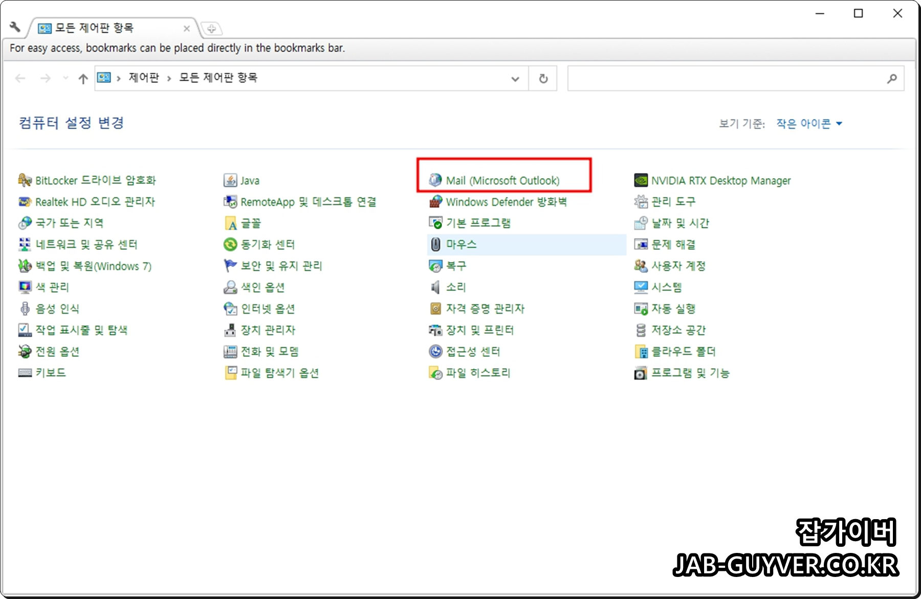 제어판 보기 방식을 ‘큰 아이콘’ 또는 ‘작은 아이콘’으로 변경하면 "Mail (Microsoft Outlook)" 항목이 보입니다.