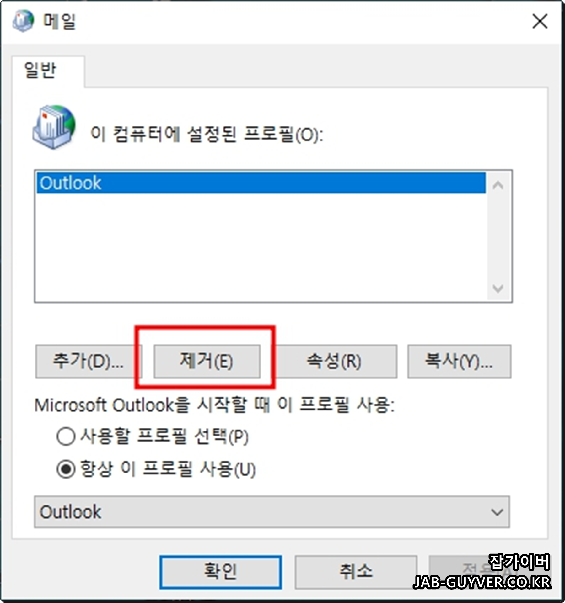 현재 컴퓨터 설정의 아웃룩 프로필을 삭제하거나 추가, 복사할 수 있습니다.