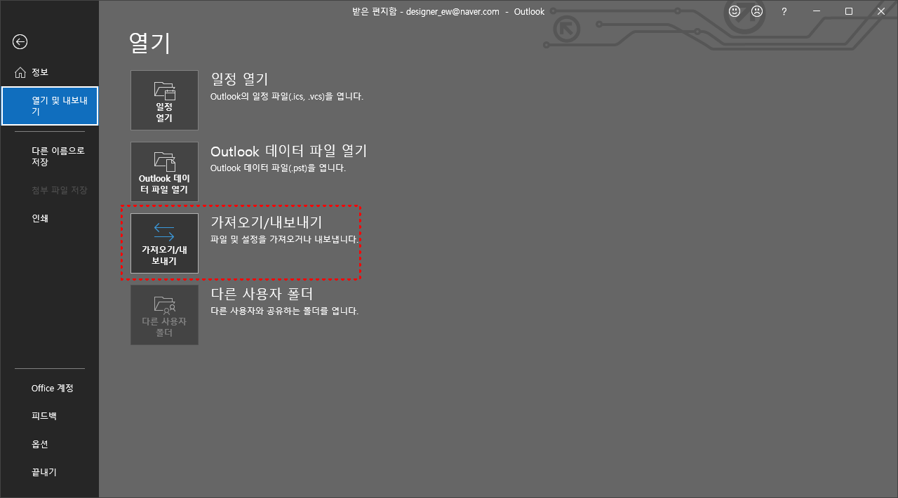 이때 상단 메뉴의 [파일] → [열기 및 내보내기] → [Outlook 데이터 파일 열기] 항목을 클릭하여, 앞서 백업해둔 .pst 파일을 찾아 불러옵니다.
