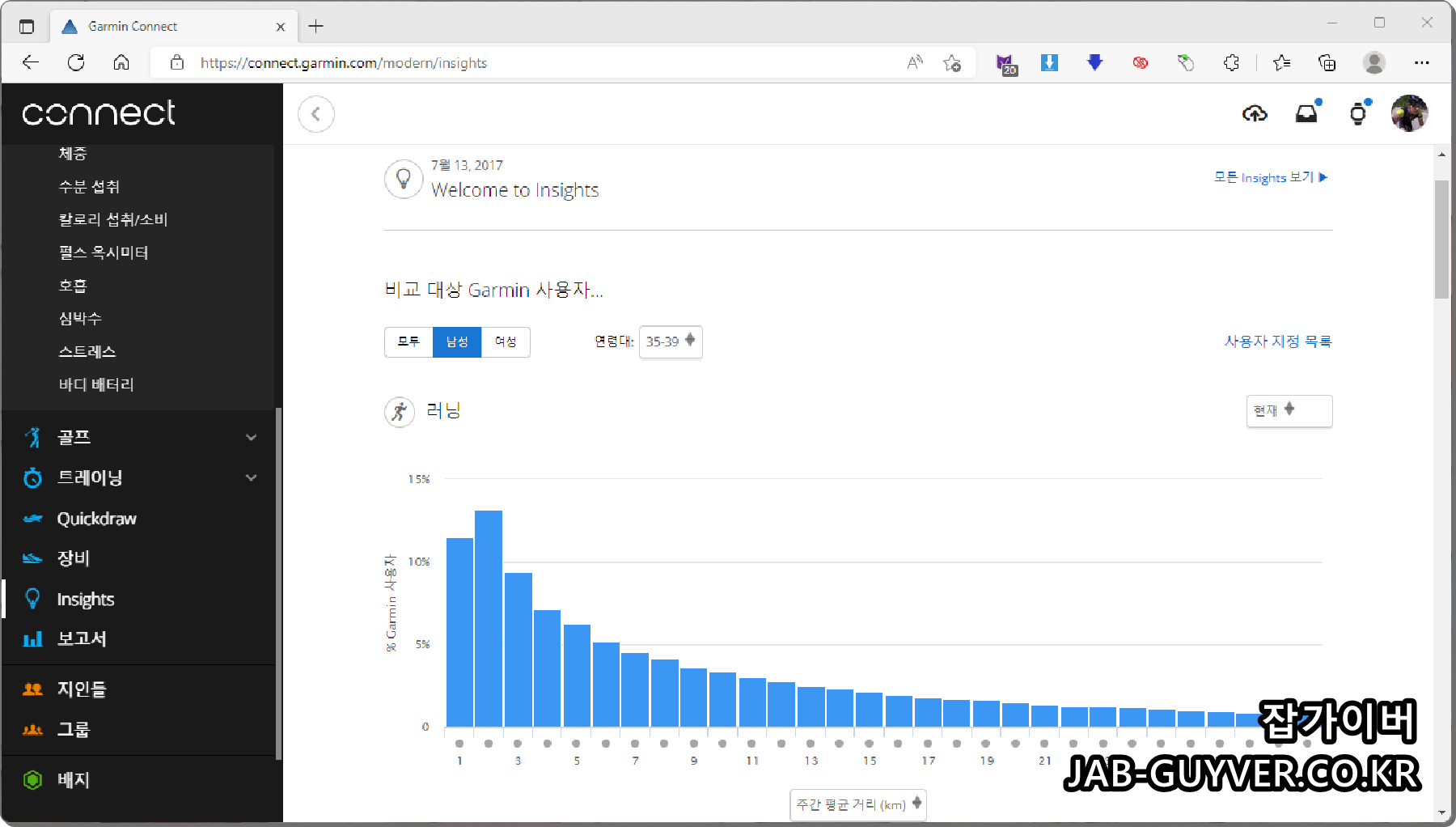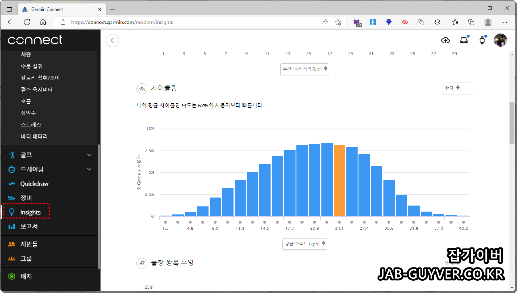 Insigths를 통해 싸이클링 및 달리기 등 전체 사용자 중 자신의 역량 수준을 확인해 볼 수 있는점도 재밌는 기능입니다.