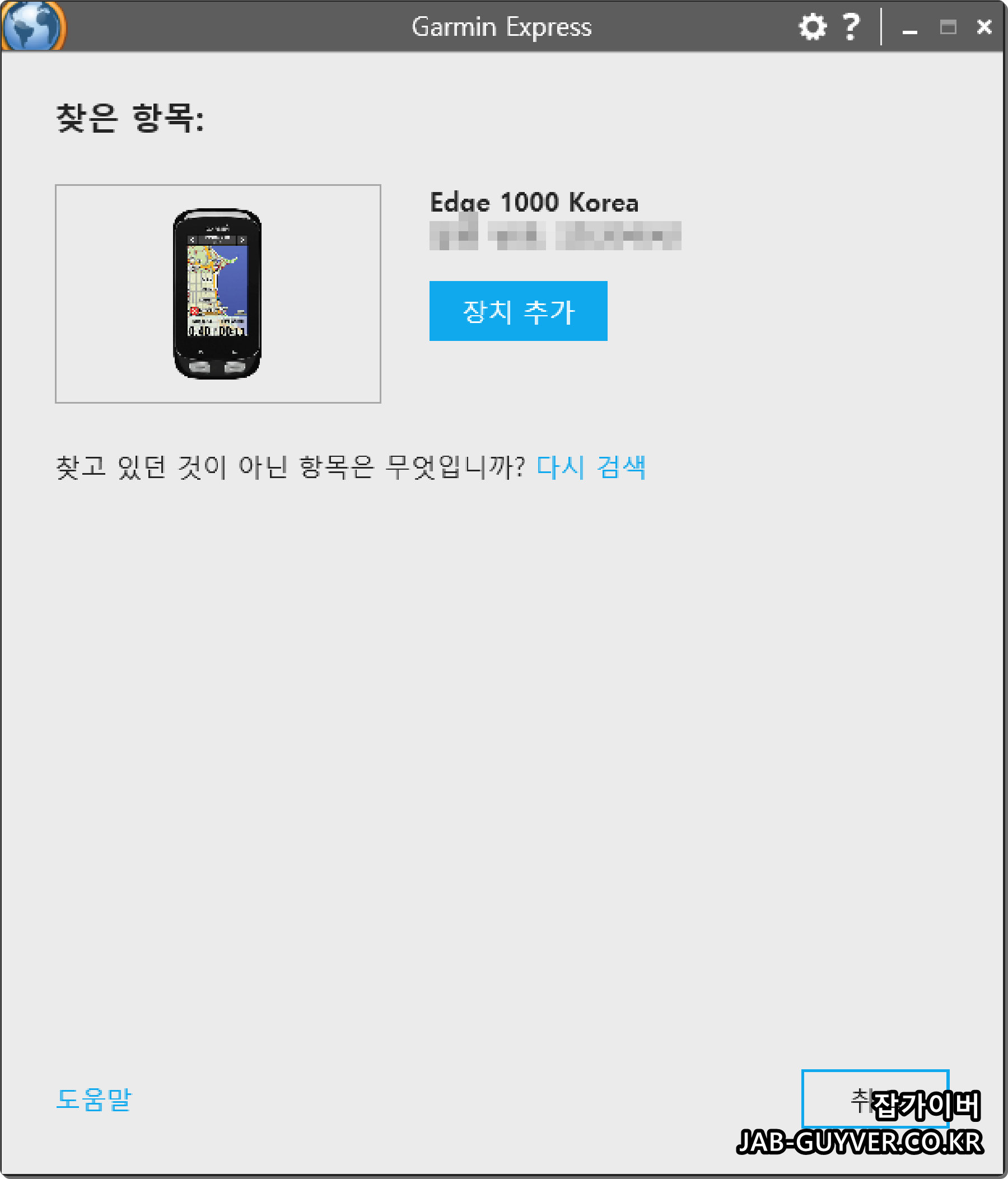 장치추가를 눌러주면 컴퓨터 데이터케이블과 연결된 가민을 자동으로 인식하게 되며 가민엣지 제품의 시리얼넘버 "제품키"도 확인할 수 있습니다.