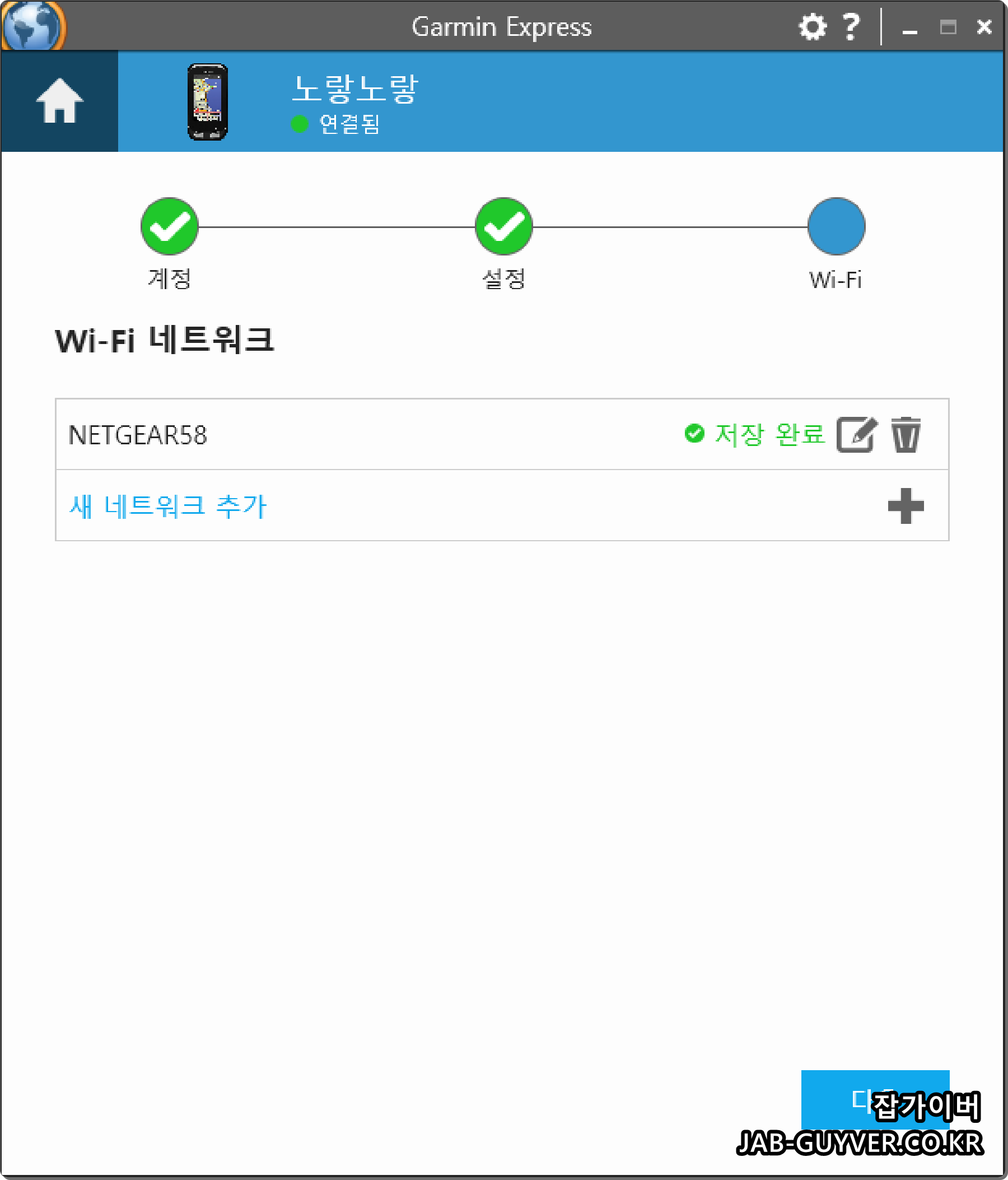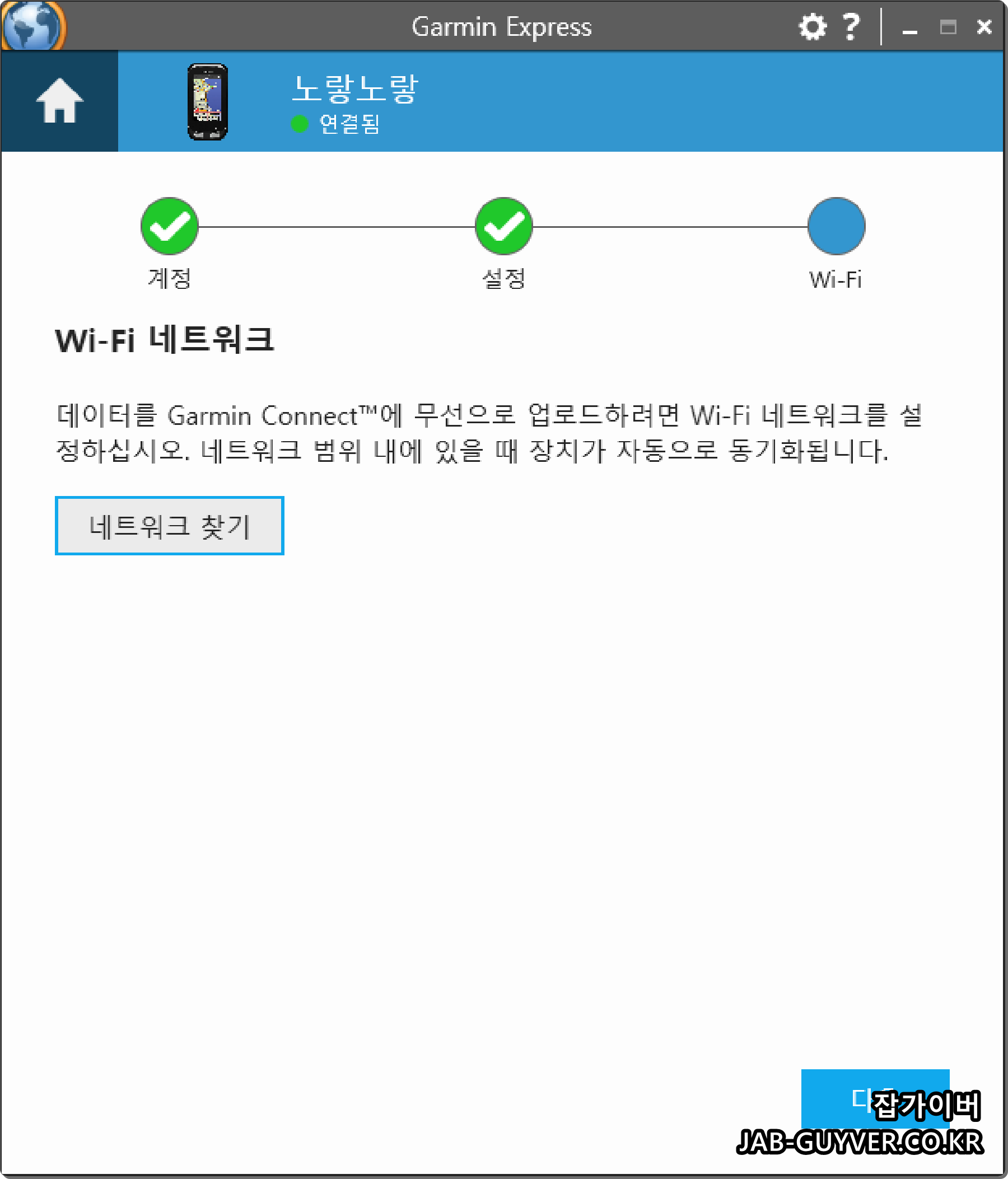 이후 와이파이 추가 및 가민데이터 업로드 설정이 가능합니다.