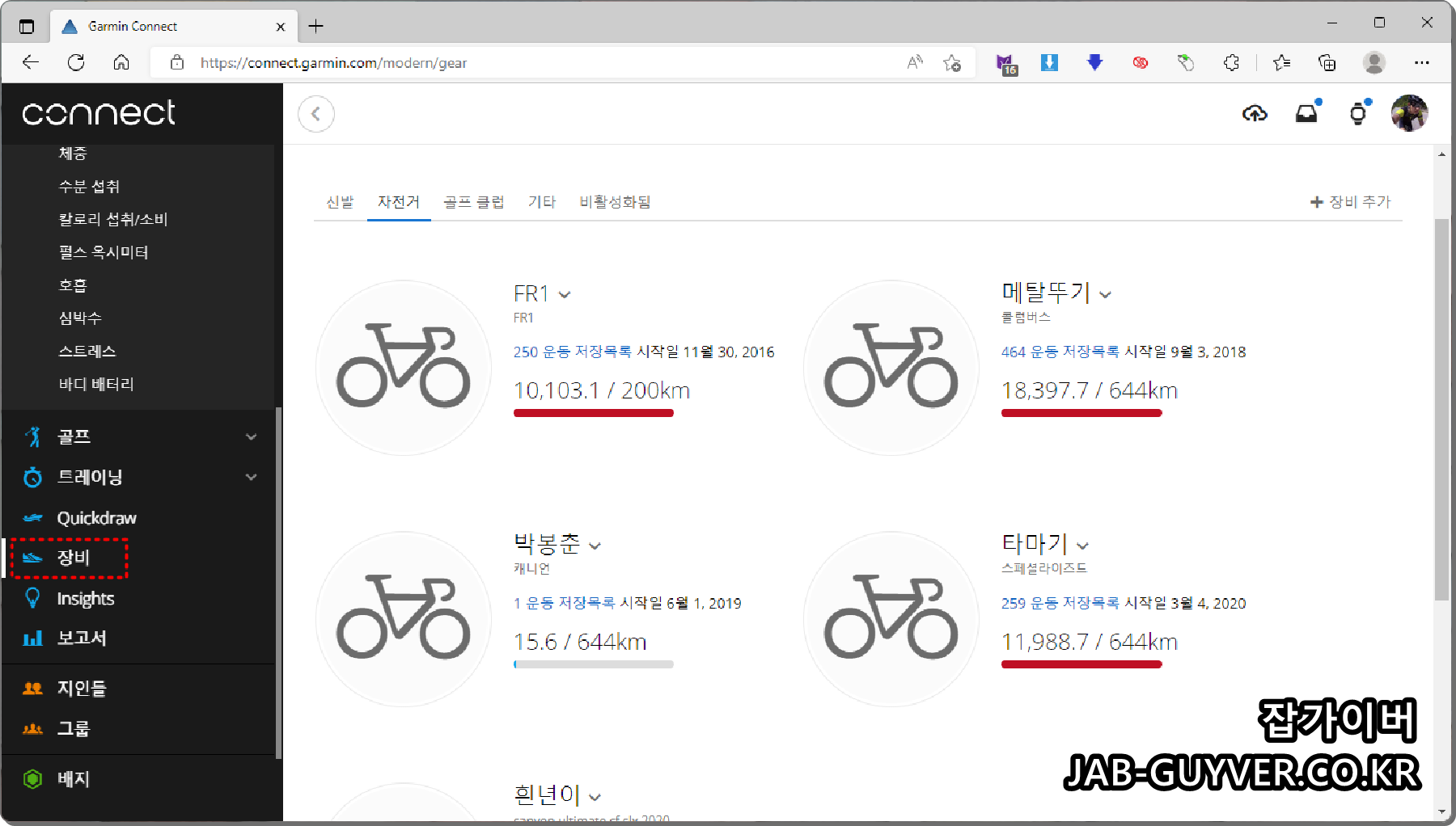 장비에서는 운동장비를 추가해서 각각에 장비마다 사용한 기간등을 확인하여 교체시기를 확인할 수 있으며 이 경우 가민보다는 스트라바에 자전거 외에도 체인이나 타이어, 브레이크패드, 로터등 각 자전거 장비에 부가적인 부품을 추가해서 각 부품별 마일리지 수명을 확인하느것을 추천합니다.