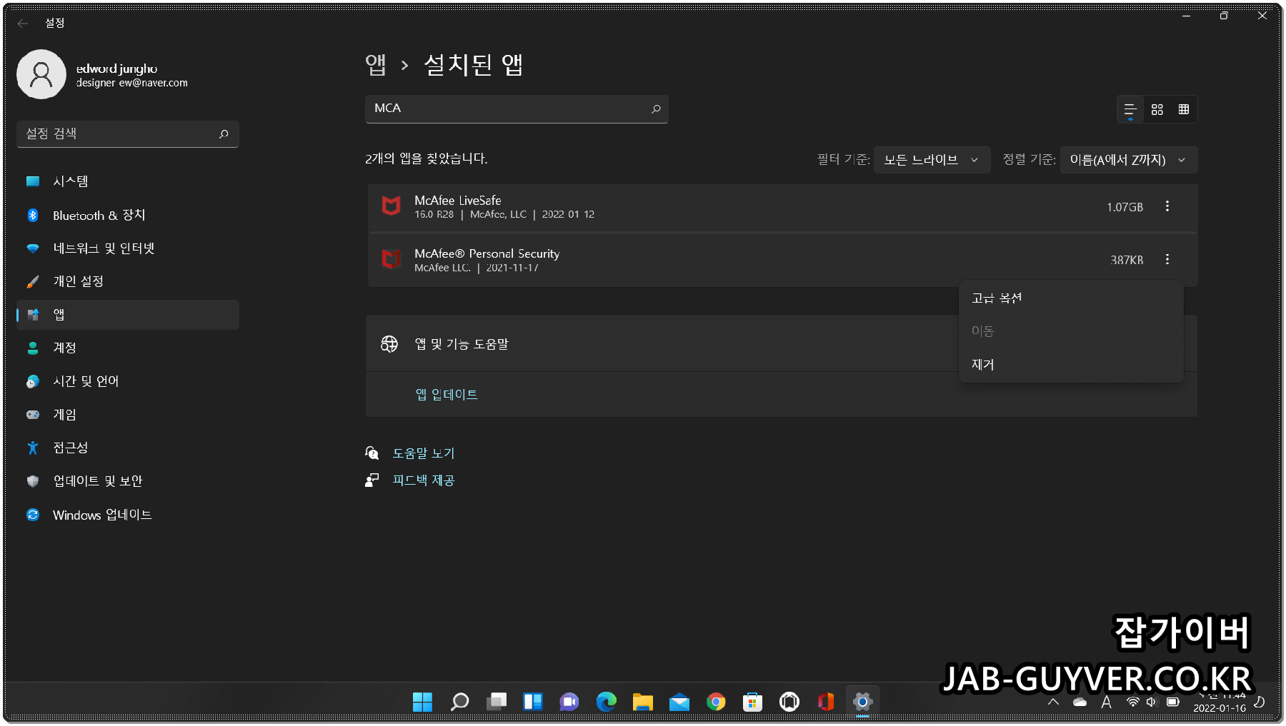 윈도우 보안 맥아피 McAfee 삭제 종류