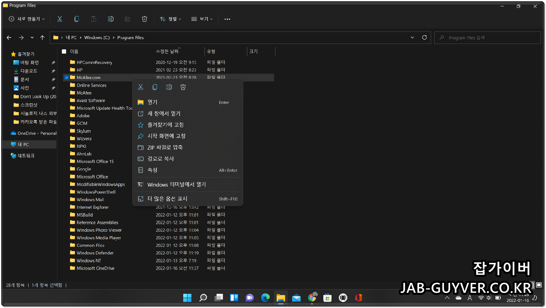 프로그램 추가삭제를 통해 모두 McAfee 삭제하더라도 C드라이브에 들어가면 잔여 찌꺼기 임시파일이 있습니다.