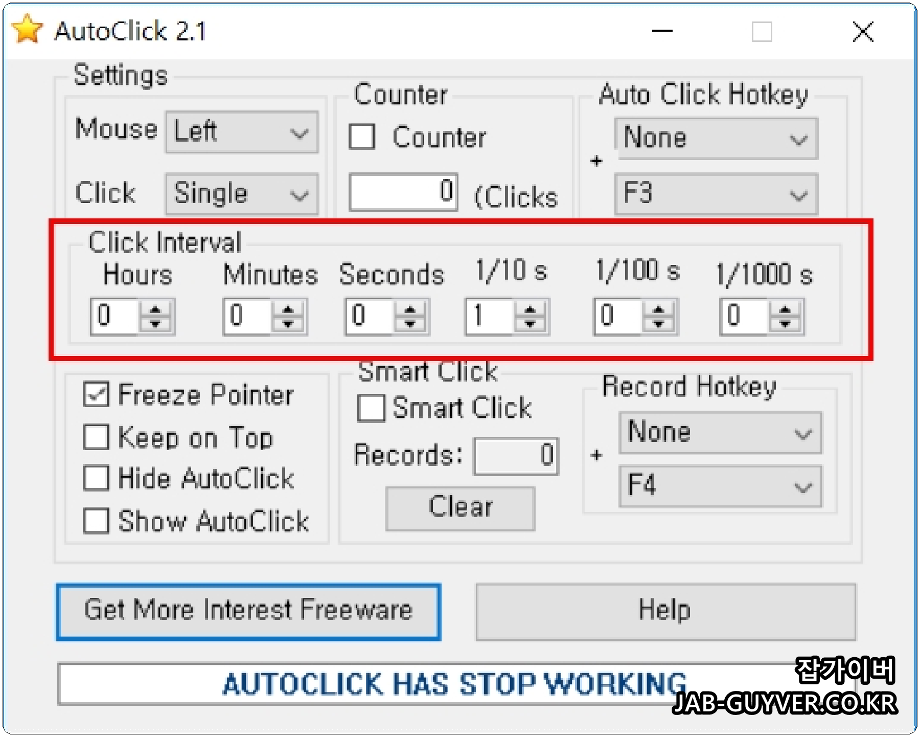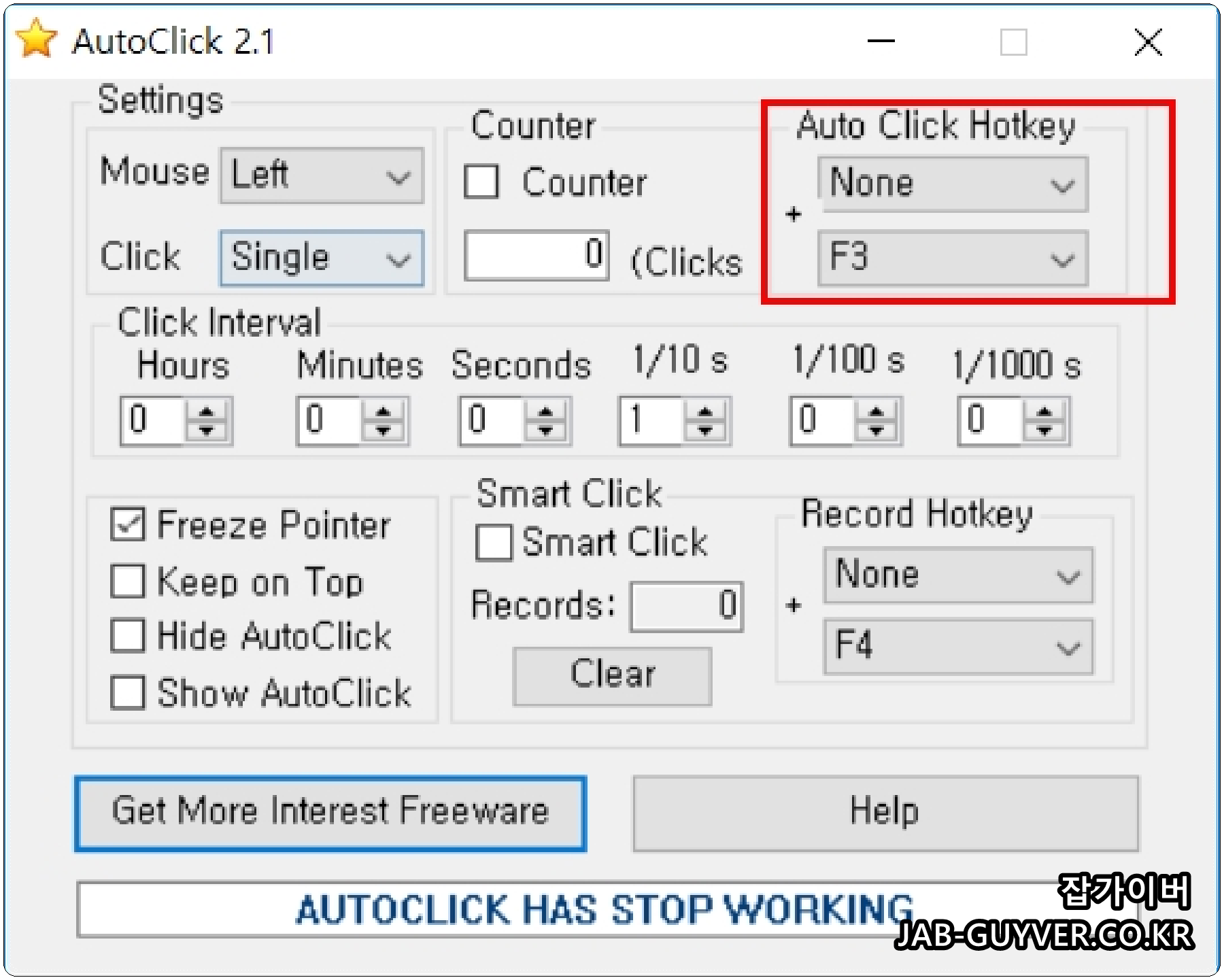 - 실행 횟수를 설정하는 곳으로 Counter를 체크하면 설정한 숫자만큼 클릭하고 멈추며 체크해제하면 무한반복 클릭하게 됩니다.