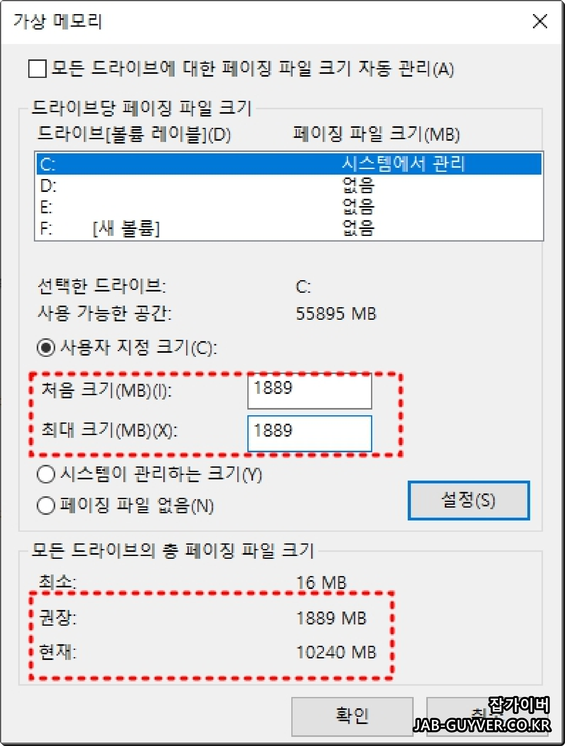 또는 임시적으로 "모든 드라이브에 대해 자동 관리"로 돌려 설정 충돌을 해소한 후 다시 수동 설정을 시도합니다.