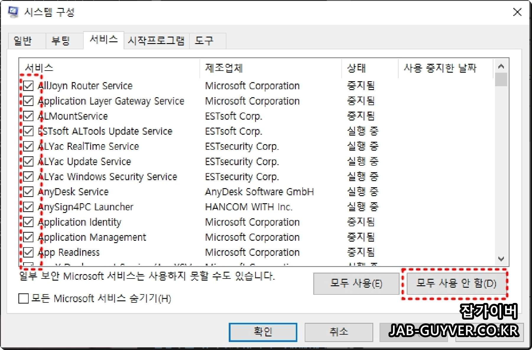 - 서비스탭에서 모든 프로그램을 체크해제합니다.
