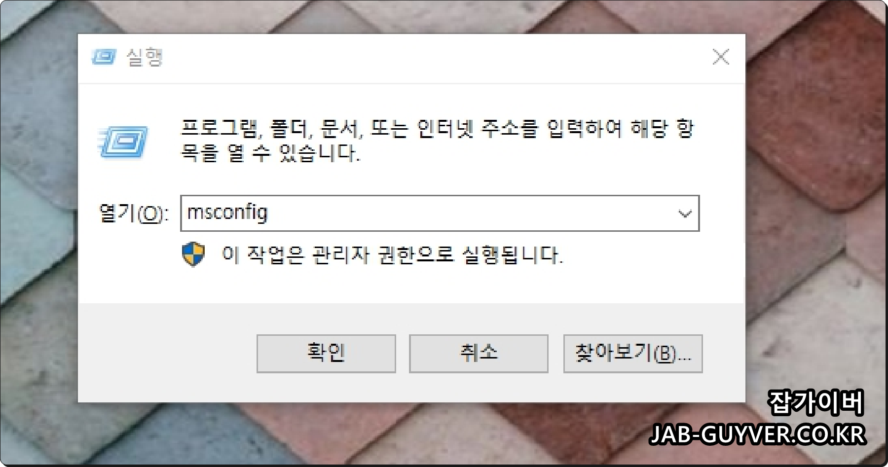 윈도우 키 + R 실행 창에 MSCONFIG 입력 후 확인을 눌러 시스템 구성을 실행합니다.
