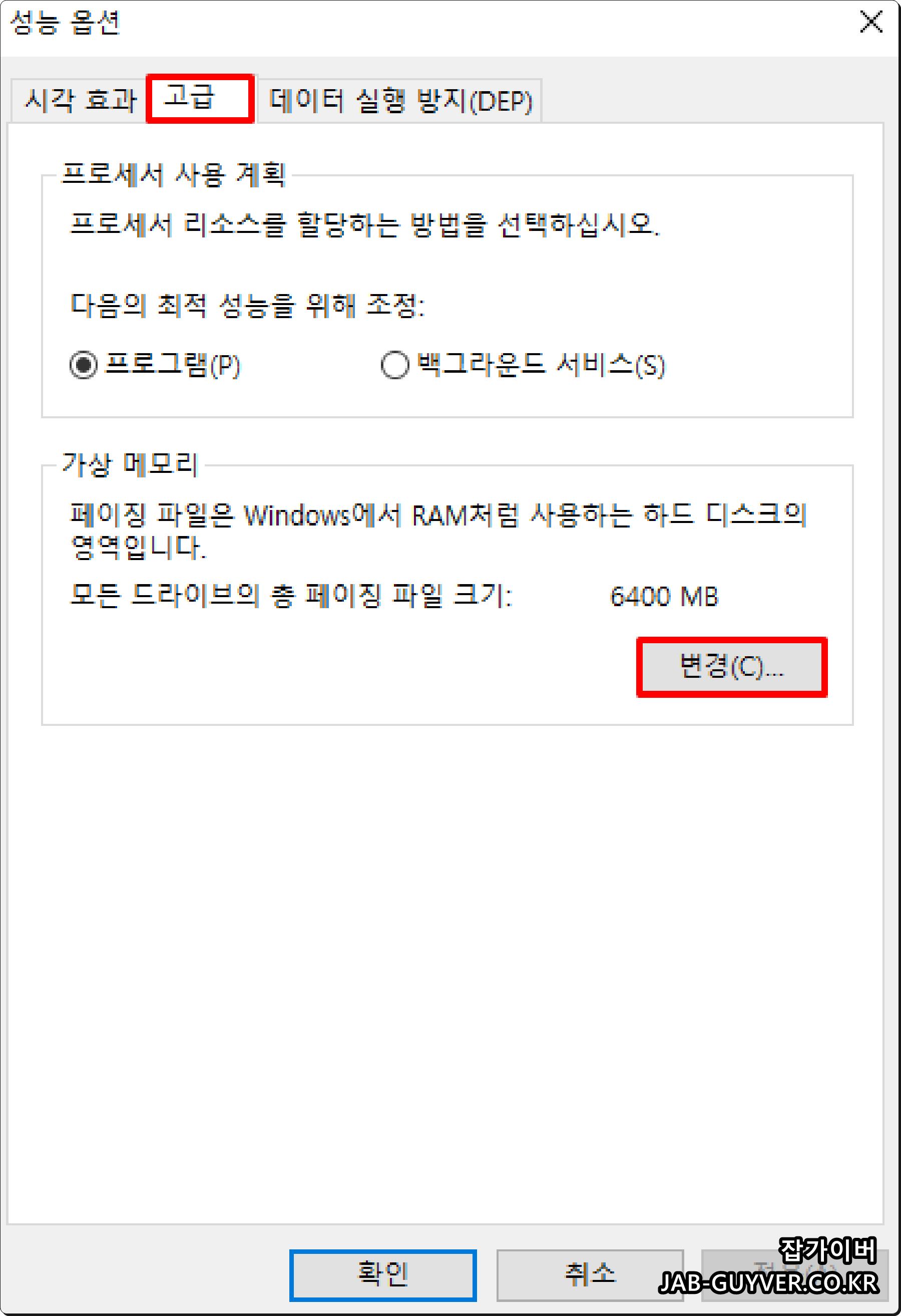 고급 -> 성능탭에 있는 설정을 통해 윈도우의 시각효과 및 프로세서, 일정, 메모리 사용과 가상메모리 용량을 설정할 수 있습니다.